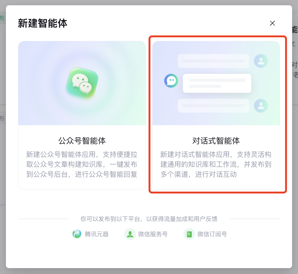 1、登录元器平台,点击 “创建智能体”,输入名称 “老年人心语倾诉”,选择 “聊天互动” 类型,一步到位;