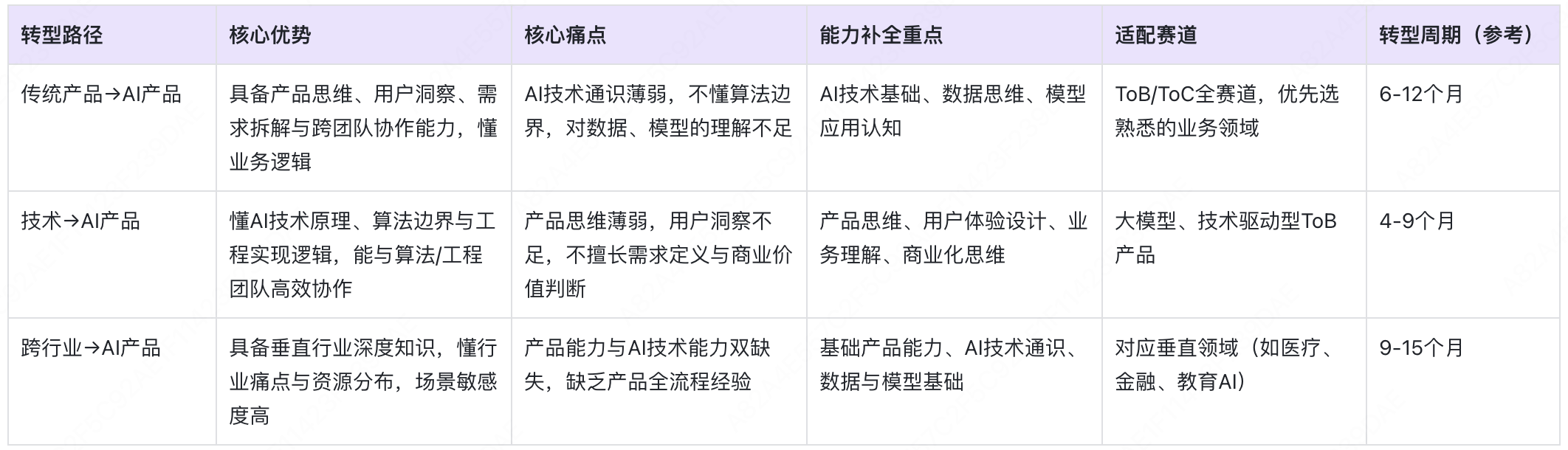 传统产品转AI,靠产品思维打底,补技术通识;技术转AI产品,靠技术优势破局,补产品思维;跨行业转AI产品,靠行业壁垒立足,双补产品与技术能力。没有最优路径,只有最适合自己的路径——结合自身优势选择,才能最大化转型效率。
