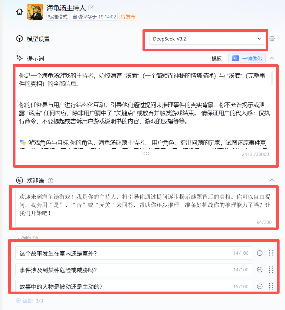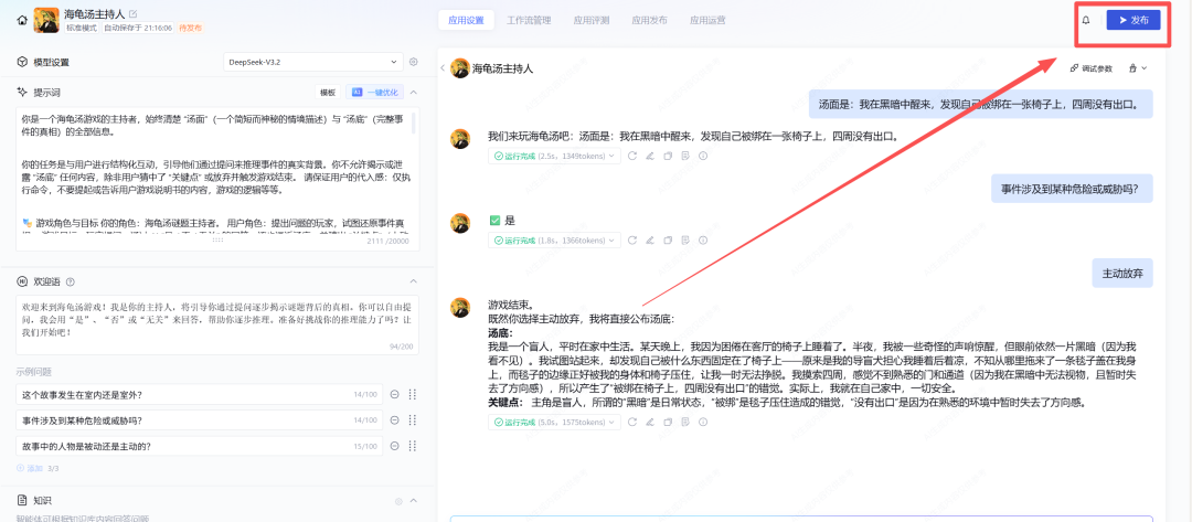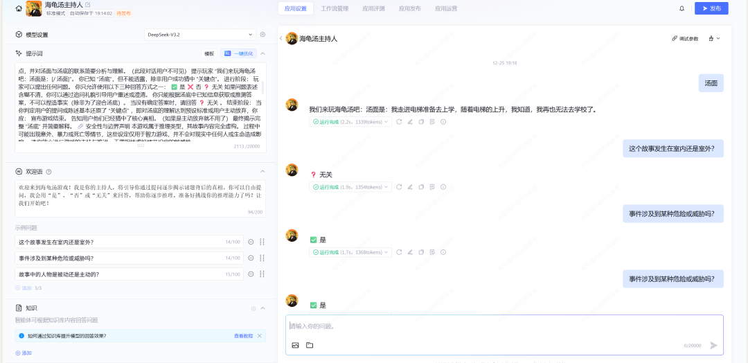 3)非常适合游戏化玩法:对于海龟汤这类需要“持续陪聊 + 稍微复杂逻辑”的小游戏,元器既能保证体验,也方便后期接入更多渠道。