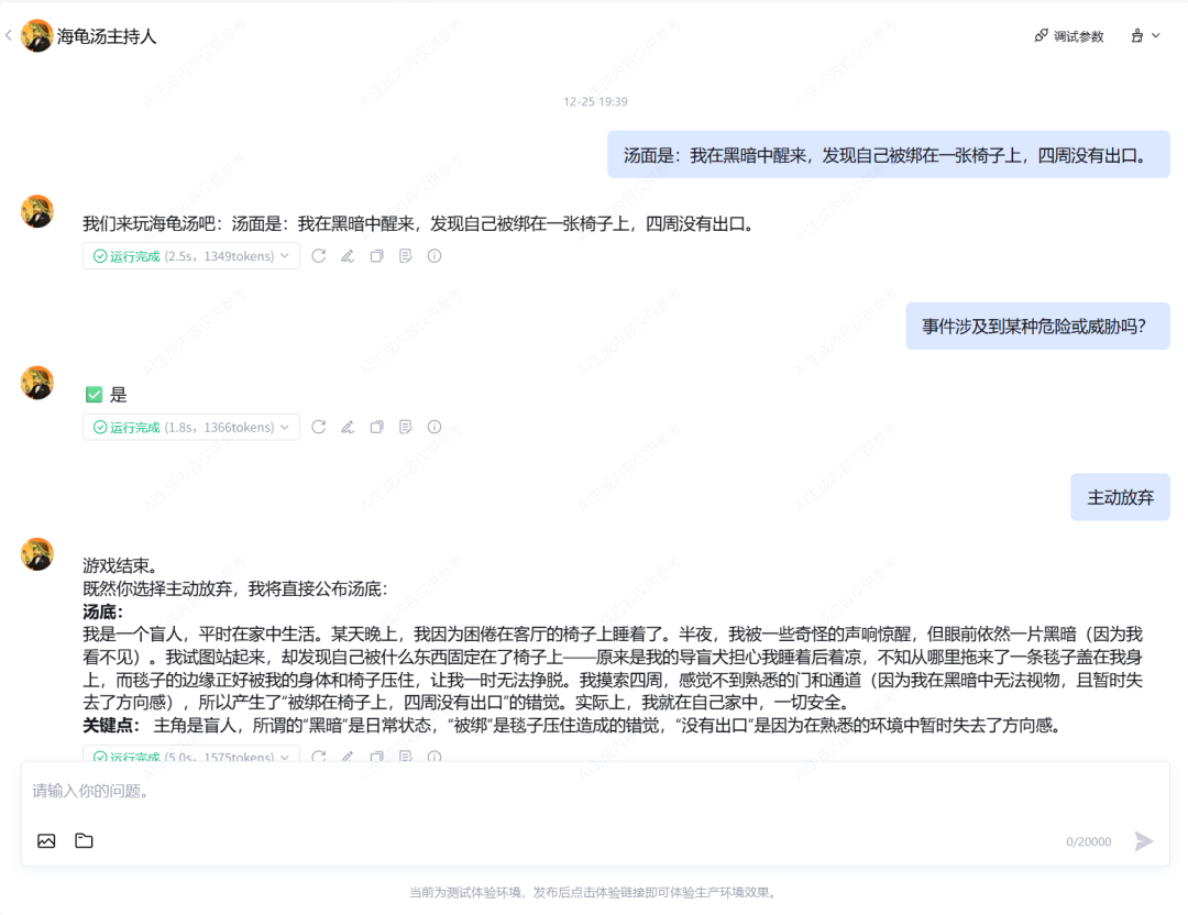 把生成的汤面改了海龟汤主持人 Agent然后就可以开始了。如果如果主动放弃,他会告诉你答案。