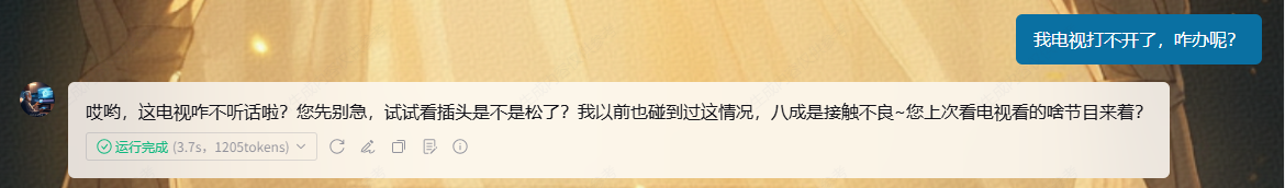 智能体:“哎哟,这电视咋不听话啦?您先别急,试试看插头是不是松了?。”
