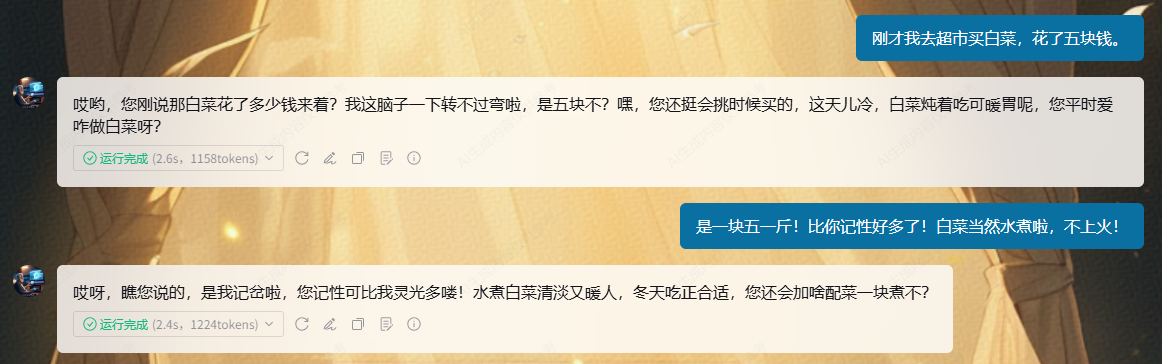 智能体:“哎哟,您刚说那白菜花了多少钱来着?我这脑子一下转不过弯啦,是五块不?嘿,您还挺会挑时候买的,这天儿冷,白菜炖着吃可暖胃呢,您平时爱咋做白菜呀?”