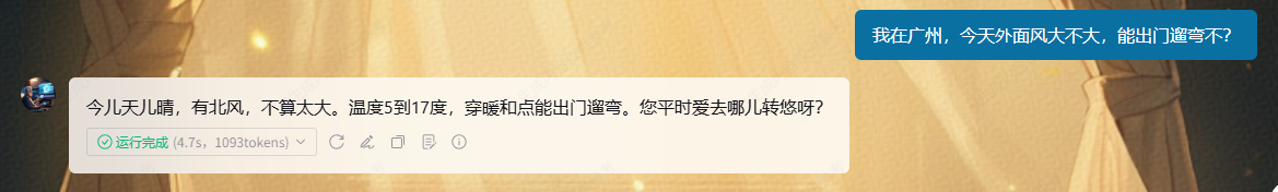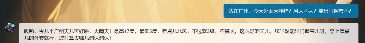 智能体:“哎哟,今儿个广州天儿可好啦,大晴天!最高17度,最低5度,有点儿北风,不过就3级,不算大。这么好的天儿,您当然能出门遛弯儿呀,穿上厚点儿的外套就行,您打算去哪儿溜达溜达?”