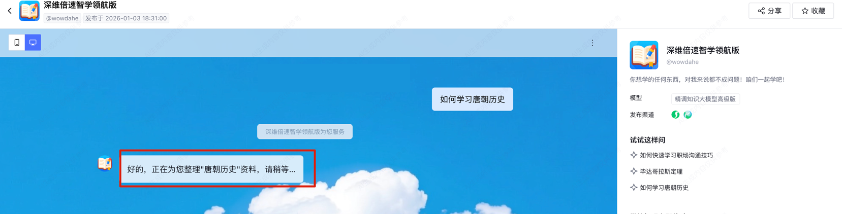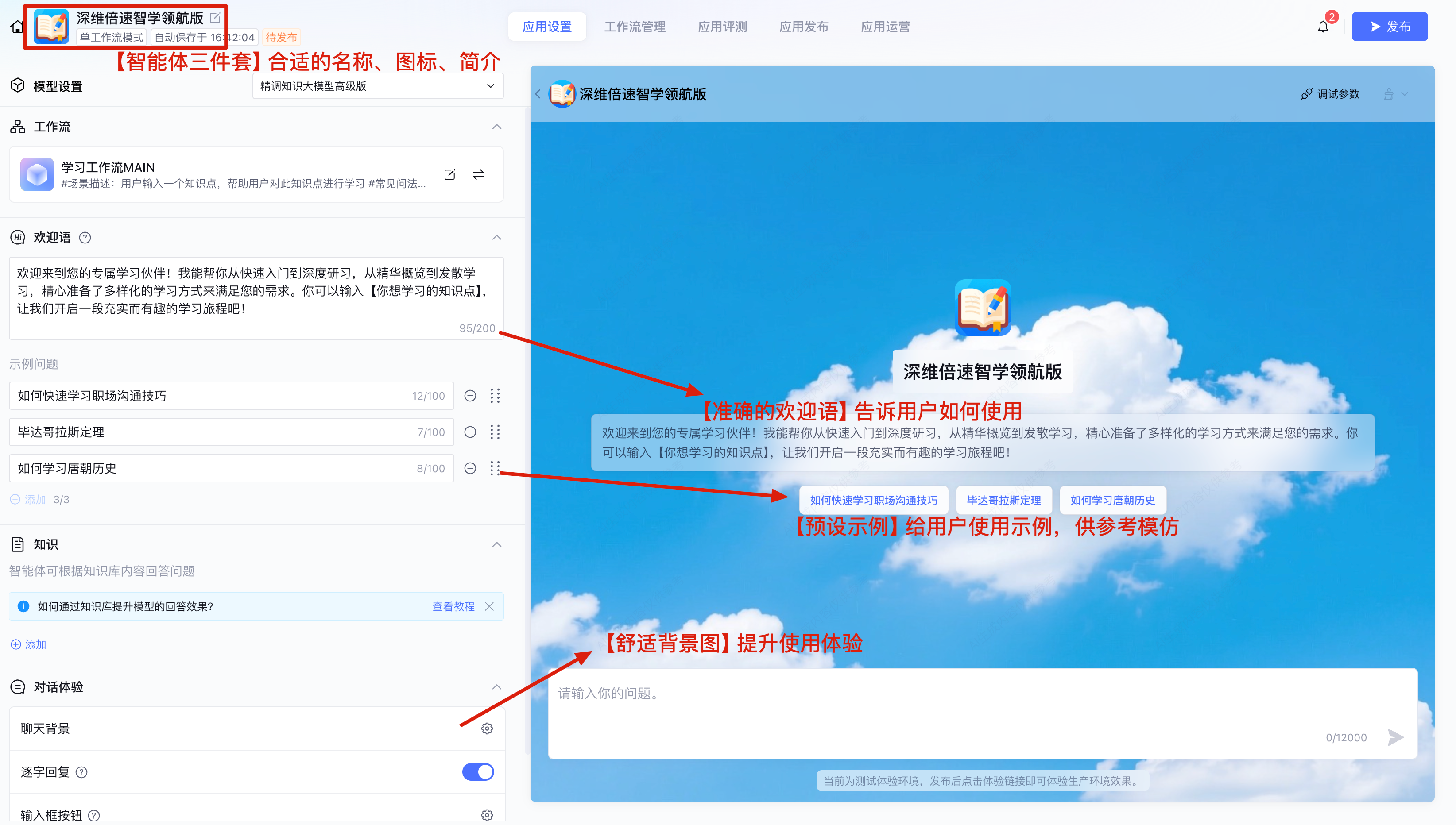 第三,设计好“第一眼”惊喜,完成用户的心理建设。 一个优秀的智能体应当自带“说明书”。从温馨的欢迎语到精心打磨的示例问法(比如“如何学习唐朝历史”),再到契合氛围的背景图,这些引导性的元数据共同构成了智能体的第一印象。通过降低用户的上手门槛,我们直接引导他们进入那个“Aha Moment”,让每一次开启都充满目标感。