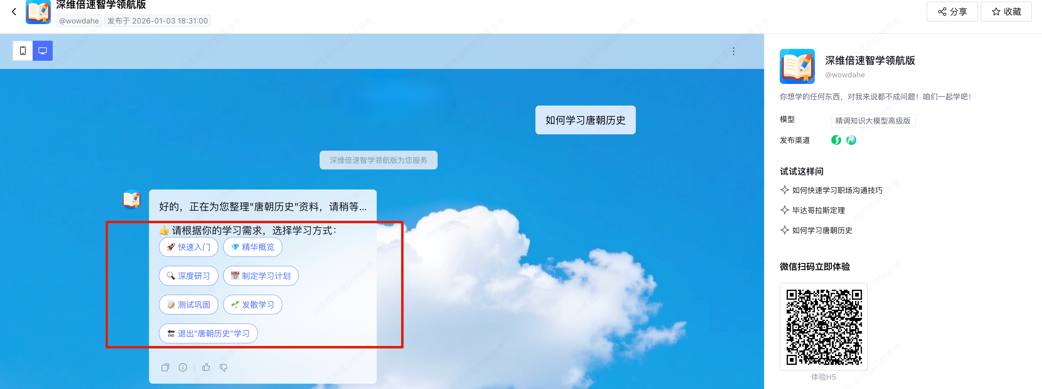 目前,“深维倍速智学领航版”已经正式上线腾讯元器。你可以直接在微信端体验这种从主干到枝叶系统化的倍速学习快感。