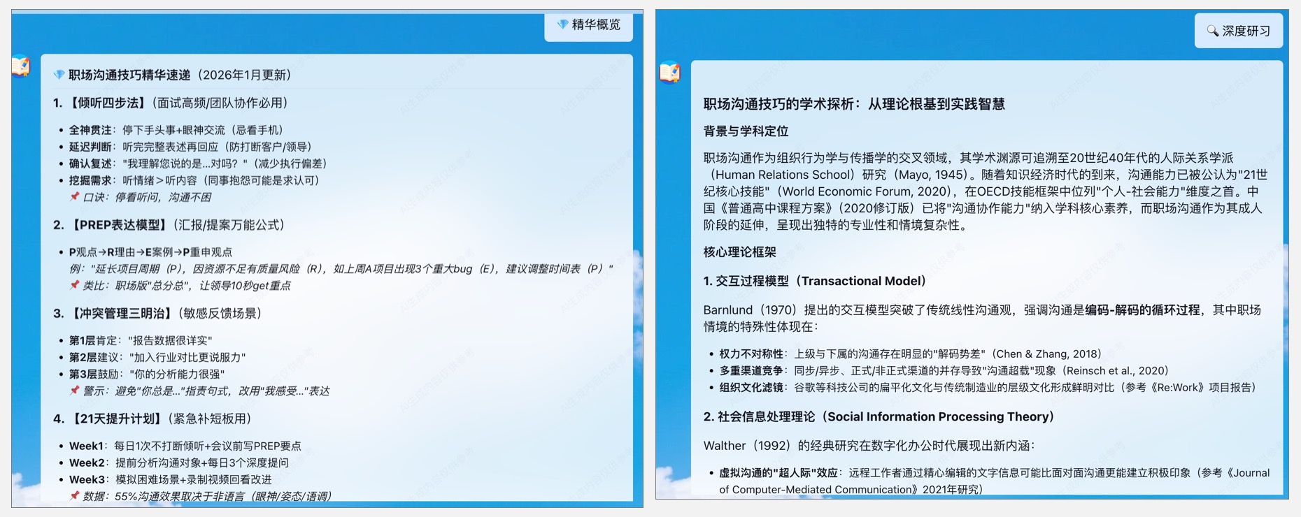 从高密度干货到系统的深度研习:点击“精华概览”,智能体会作为“知识浓缩师”剔除陈旧信息,为你奉上包含记忆口诀和核心模型的高密度摘要;而切换到“深度学习”模式后,系统则转变为“学术探路者”,从背景脉络到主流争议进行全方位拆解,带你洞察沟通技巧背后的底层逻辑。