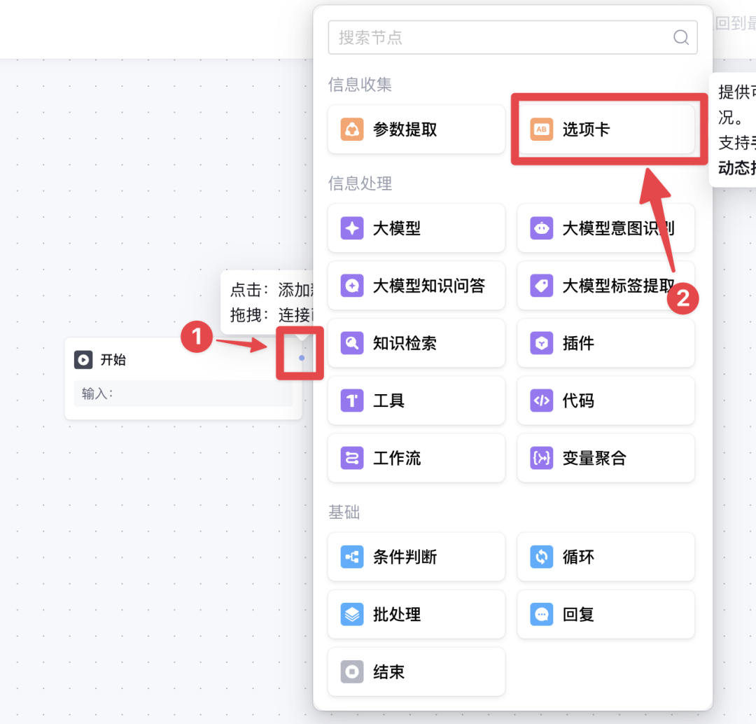 将鼠标移到开始节点的右侧,点击出现的 +号 按钮,在后面添加第一个节点——选项卡。