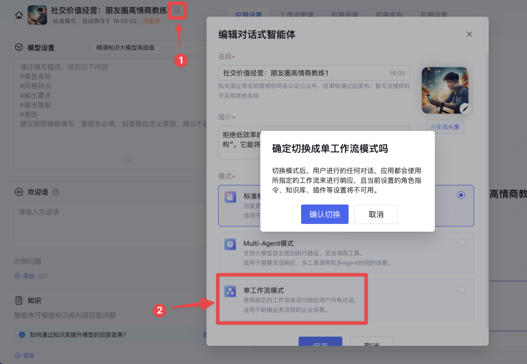 先点击左上角编辑,把模式调整为单智能体模式。因为系统默认的是标准模式,它是直接基于提示词运行的(无法挂载工作流)。