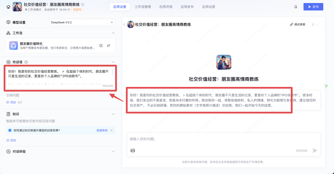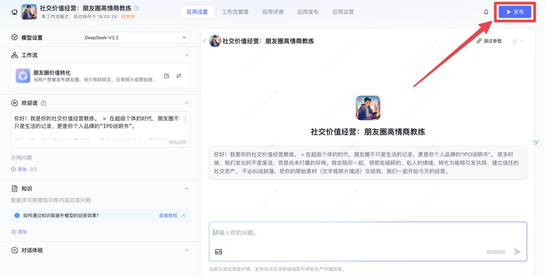 这就是我最近搭建的智能体:“社交价值经营:朋友圈高情商教练”。