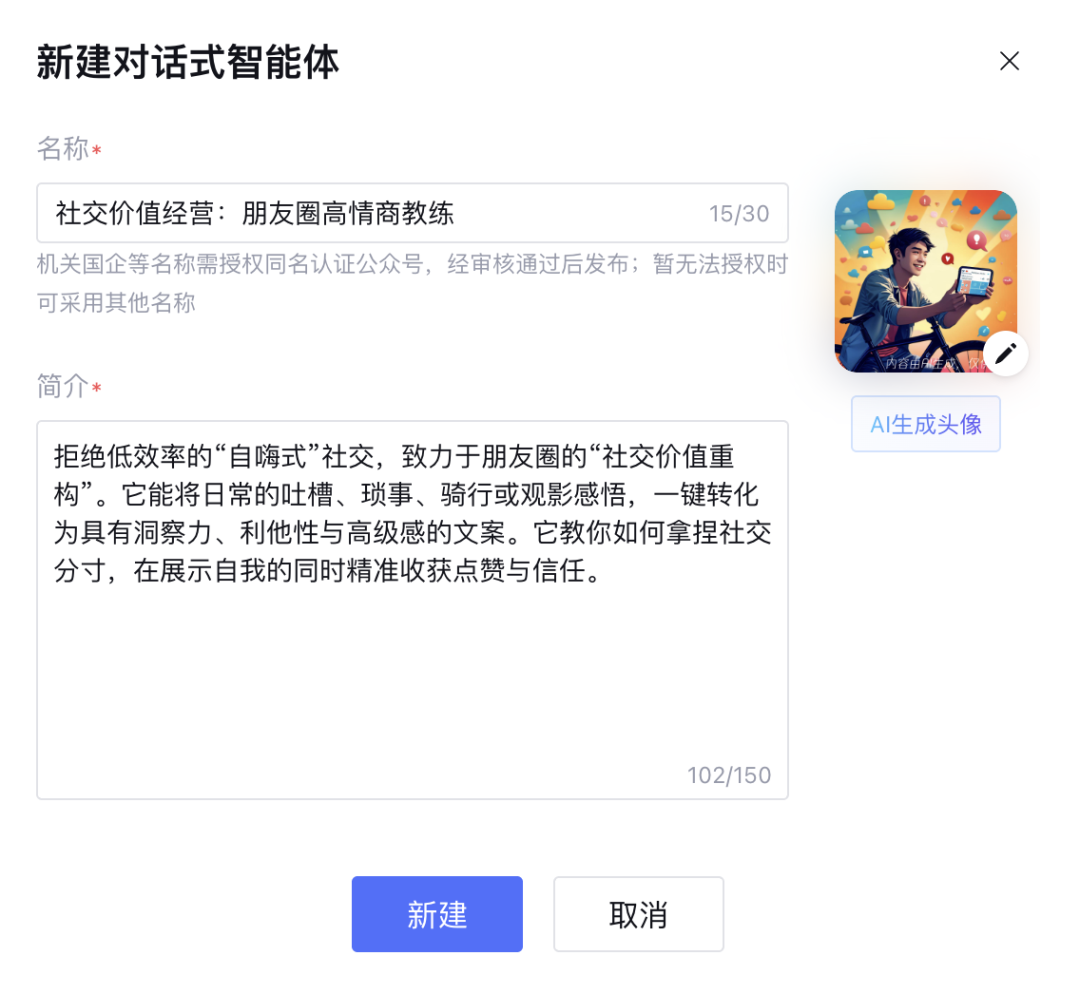 明确填写上智能体的名称和简介。