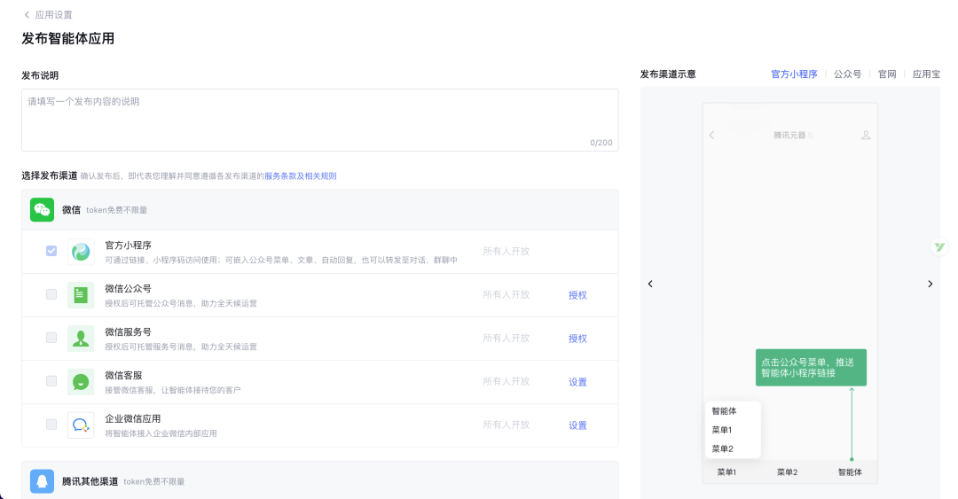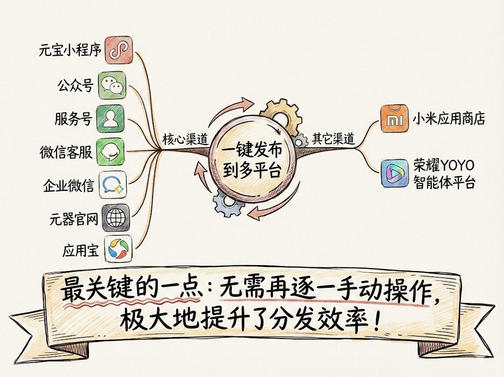 核心渠道:你可以把它发布到元宝小程序、公众号、服务号、微信客服、企业微信、元器官网、应用宝中。