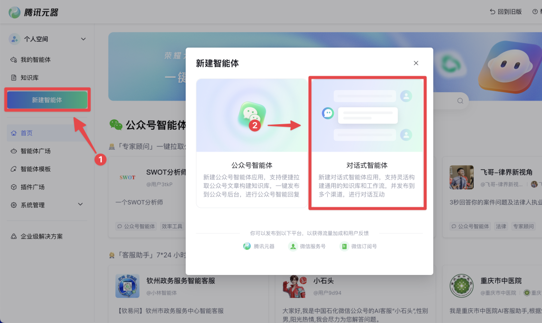 第一步,打开腾讯元器,新建对话式智能体。