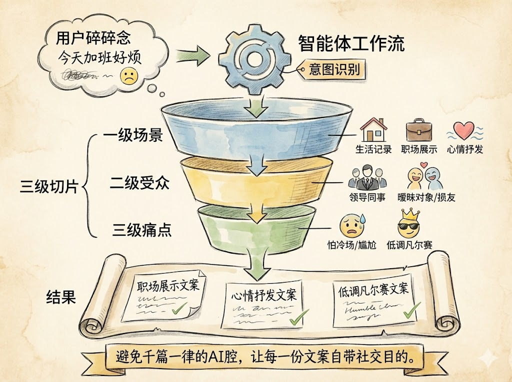 - 个性化:用户的具体琐事是独一无二的。智能体通过工作流,把标准化的社交心理学应用到用户个性的素材上,避免了“撞文案”的尴尬。