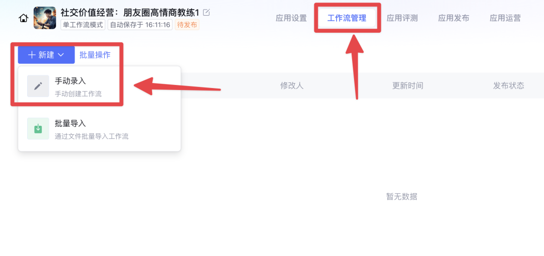 保存后,点击上方工作流管理,然后新建一个工作流。