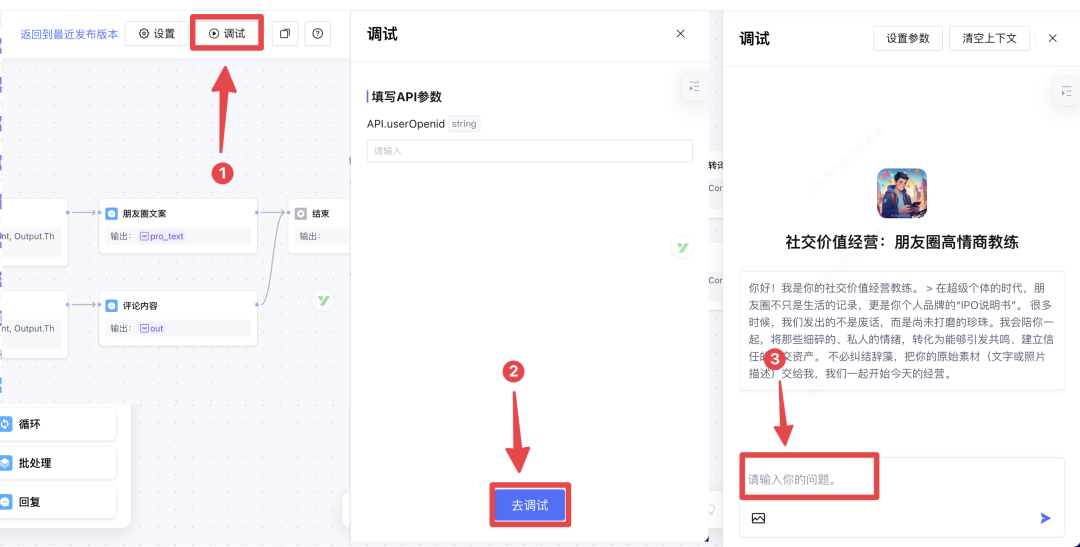 好了,工作流配置完成后,我们点击右上角的调试,一方面是为了验证工作流是否能正常工作,另一方面也能看看最终效果。