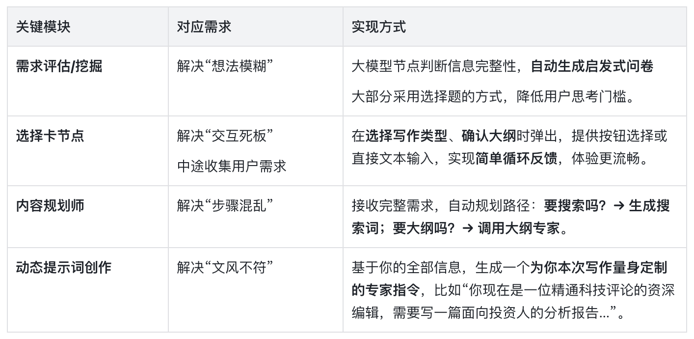 简单说:它像一个专业的写作教练,先和你一起头脑风暴定方案(需求挖掘),再帮你找资料、画蓝图(规划与大纲),最后请来一位最适合的“笔杆子”(动态专家)把蓝图变成文章。