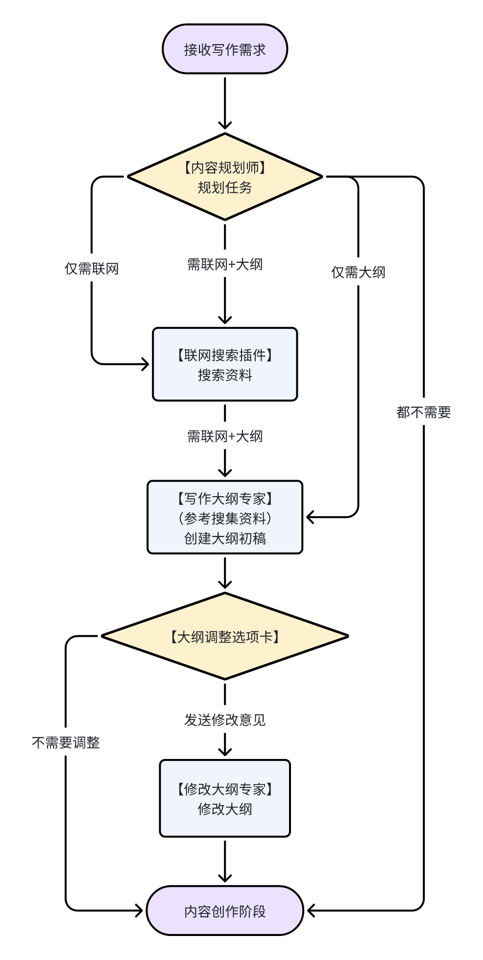 - 用户误点击「需要调整」或直接发送调整意见:进入【修改大纲大模型节点】进行大纲调整。