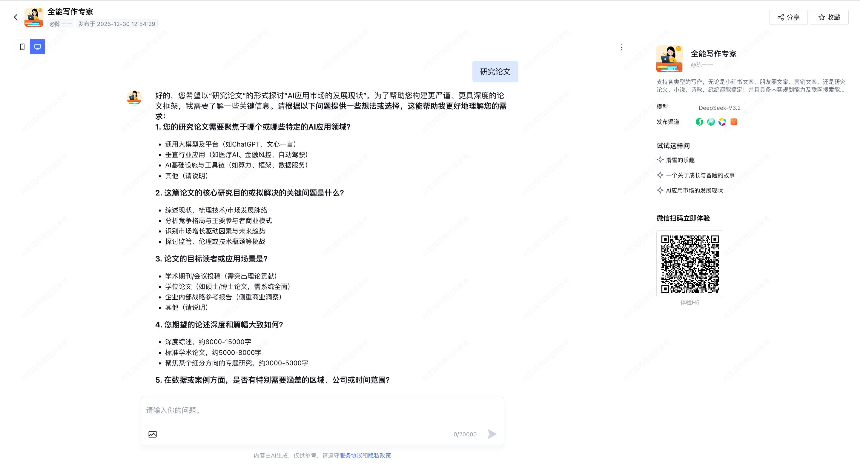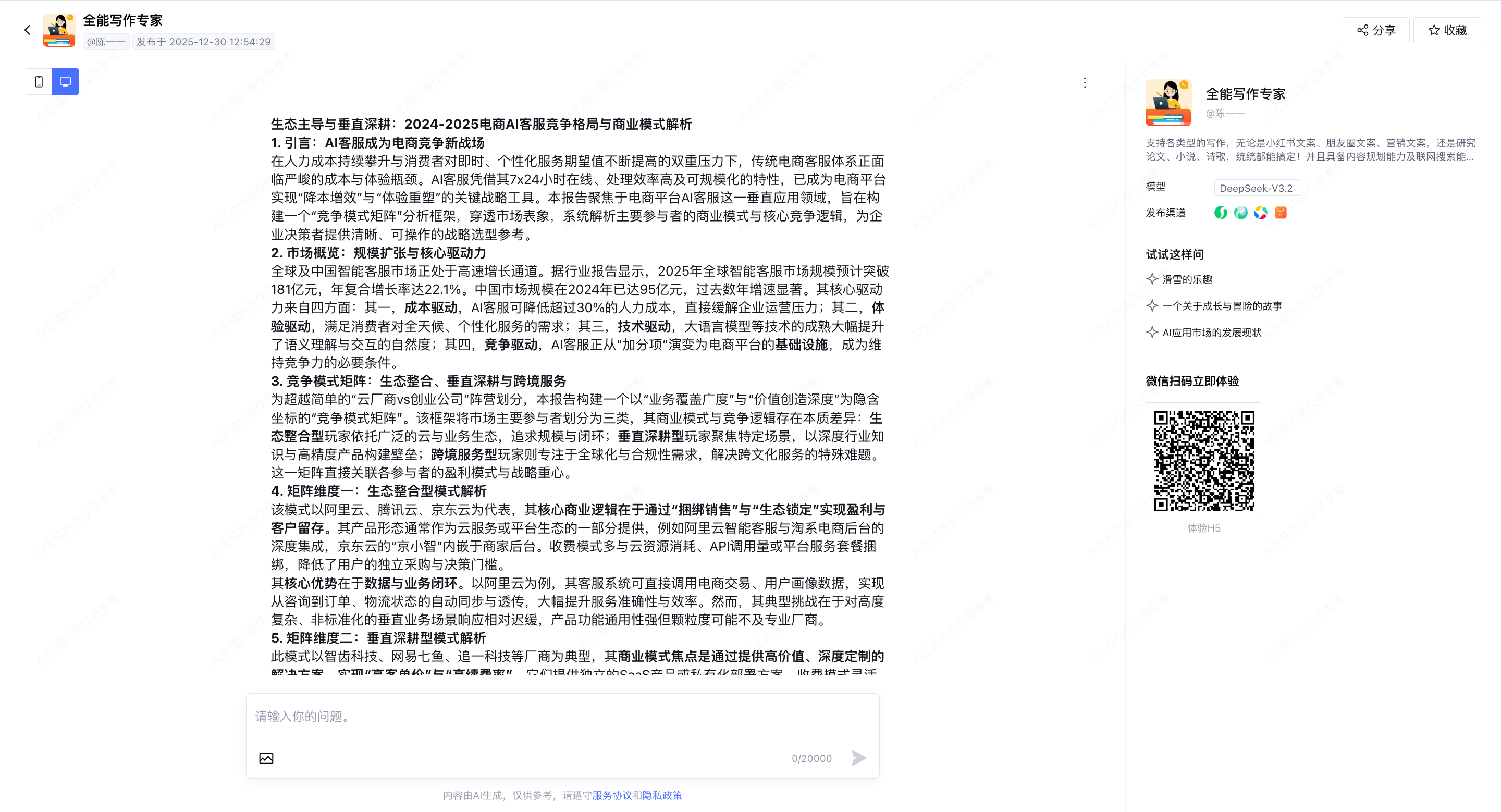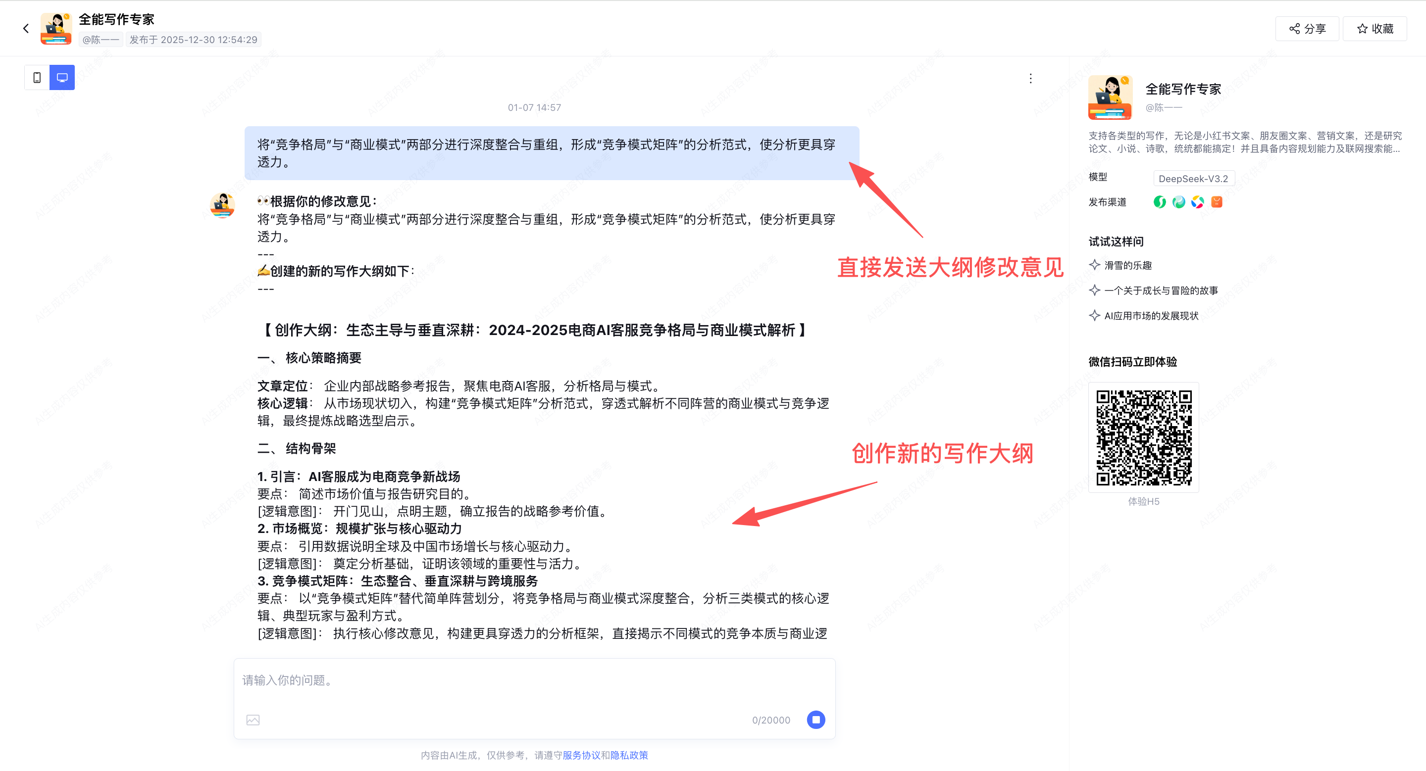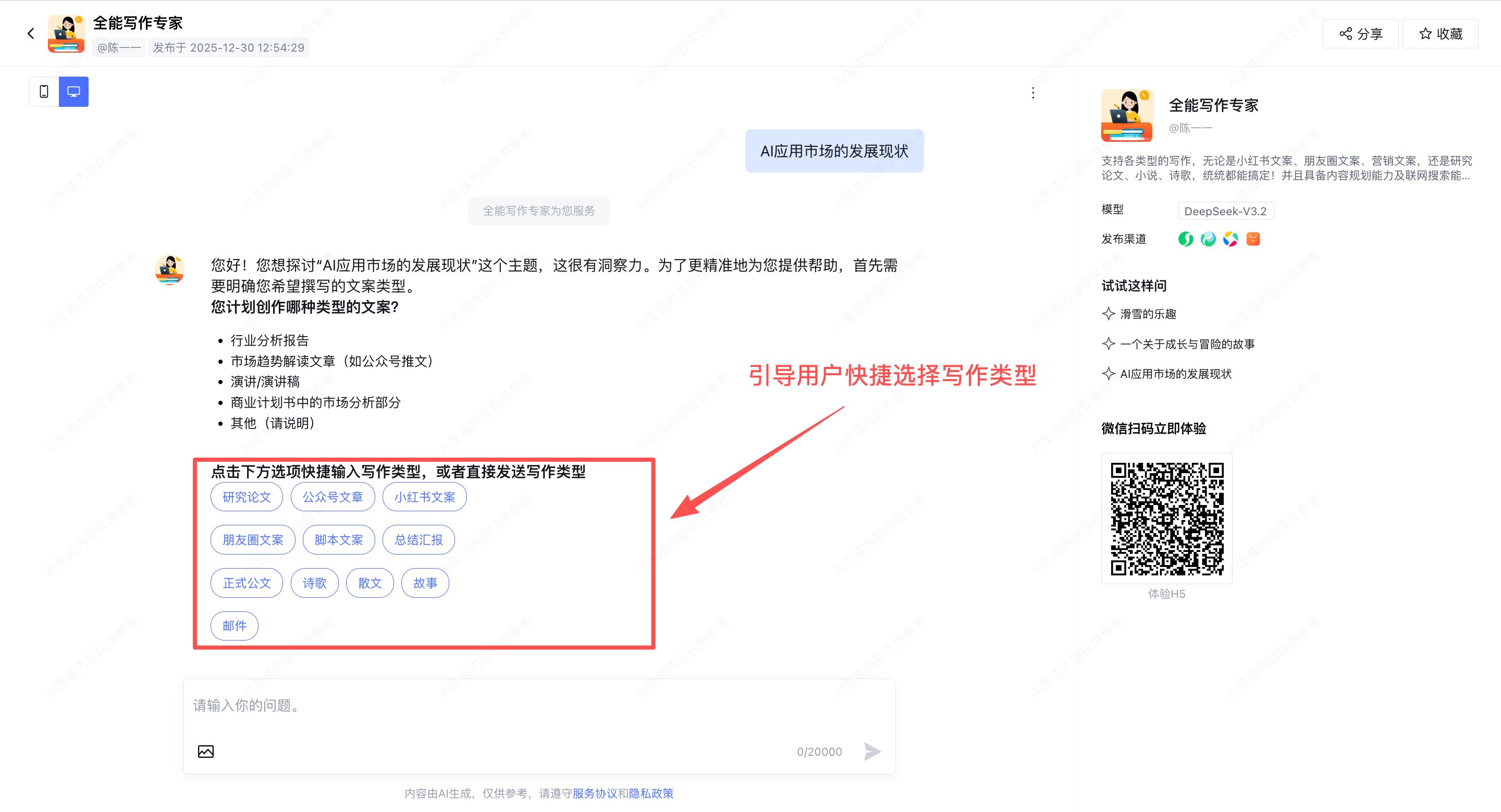 欢迎大家复制下方链接并打开网页,对话体验我搭建的「全能写作专家」智能体:
