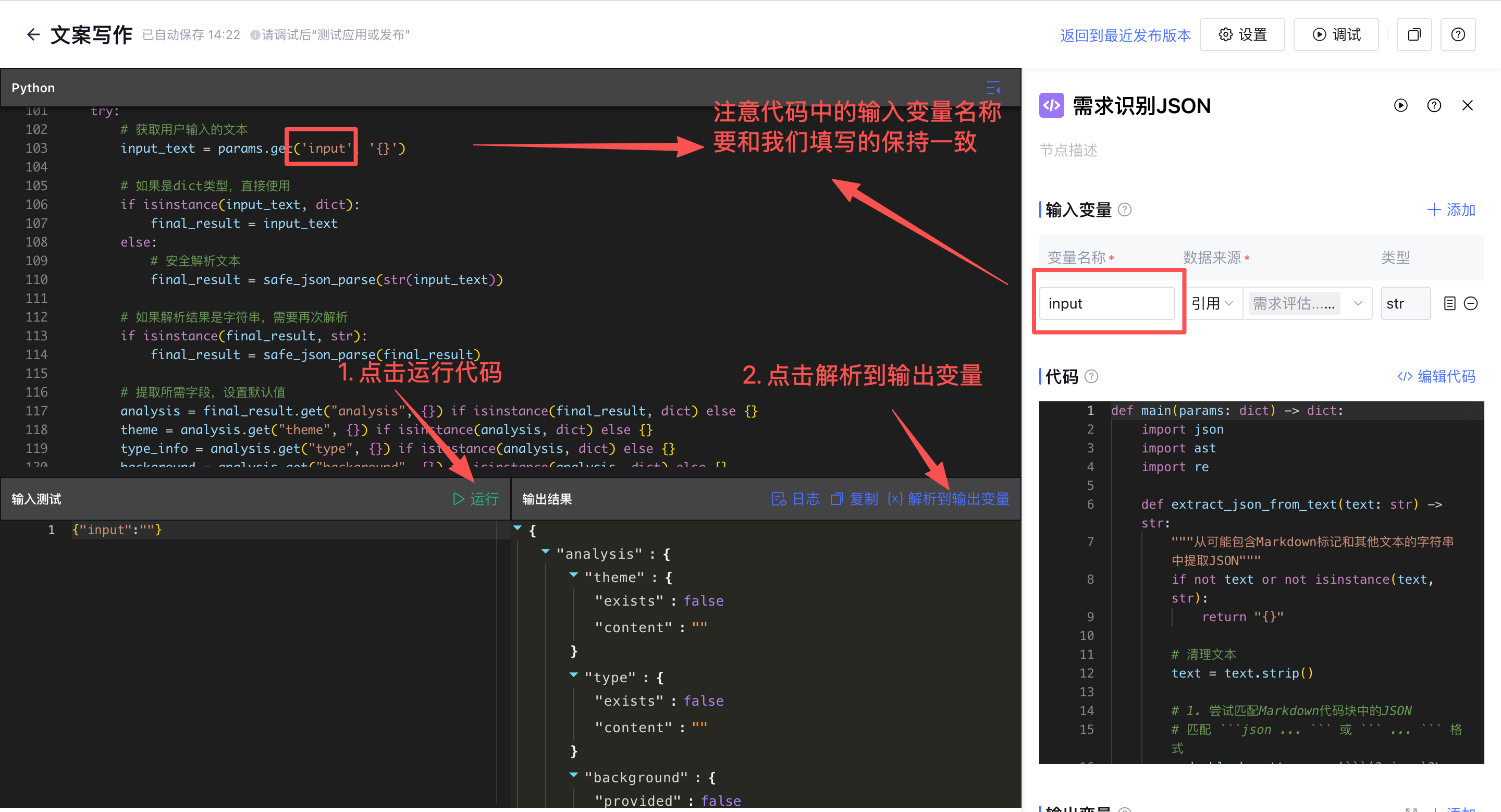 然后把代码粘贴到代码编辑器中尝试运行测试,运行成功后会输出我们想要的JSON结构,点击「解析到输出变量」就自动填写好输出的JSON结构内容了。这里注意,变量名称和代码中的输入变量名称要保持一致,否则会运行出错。