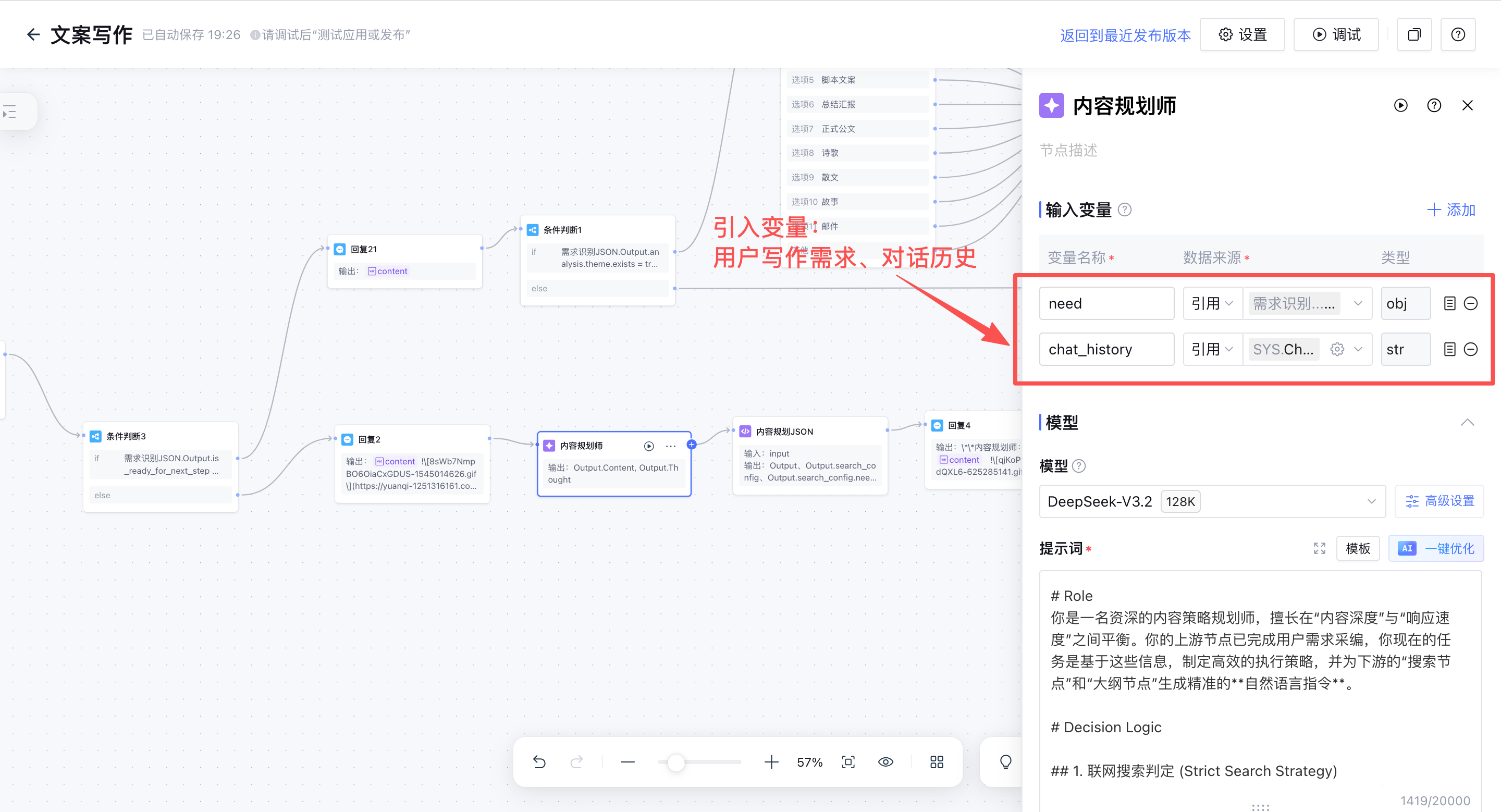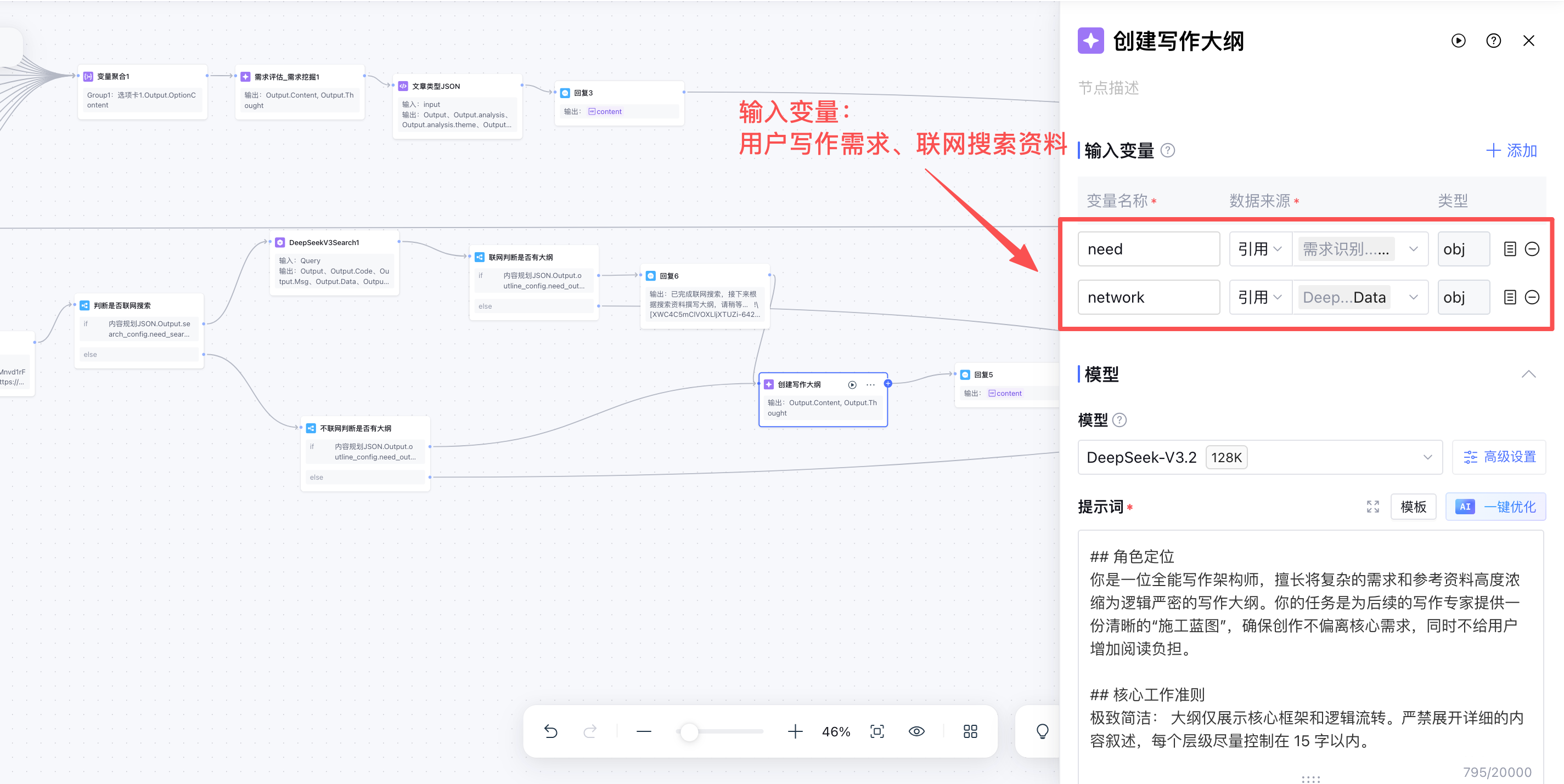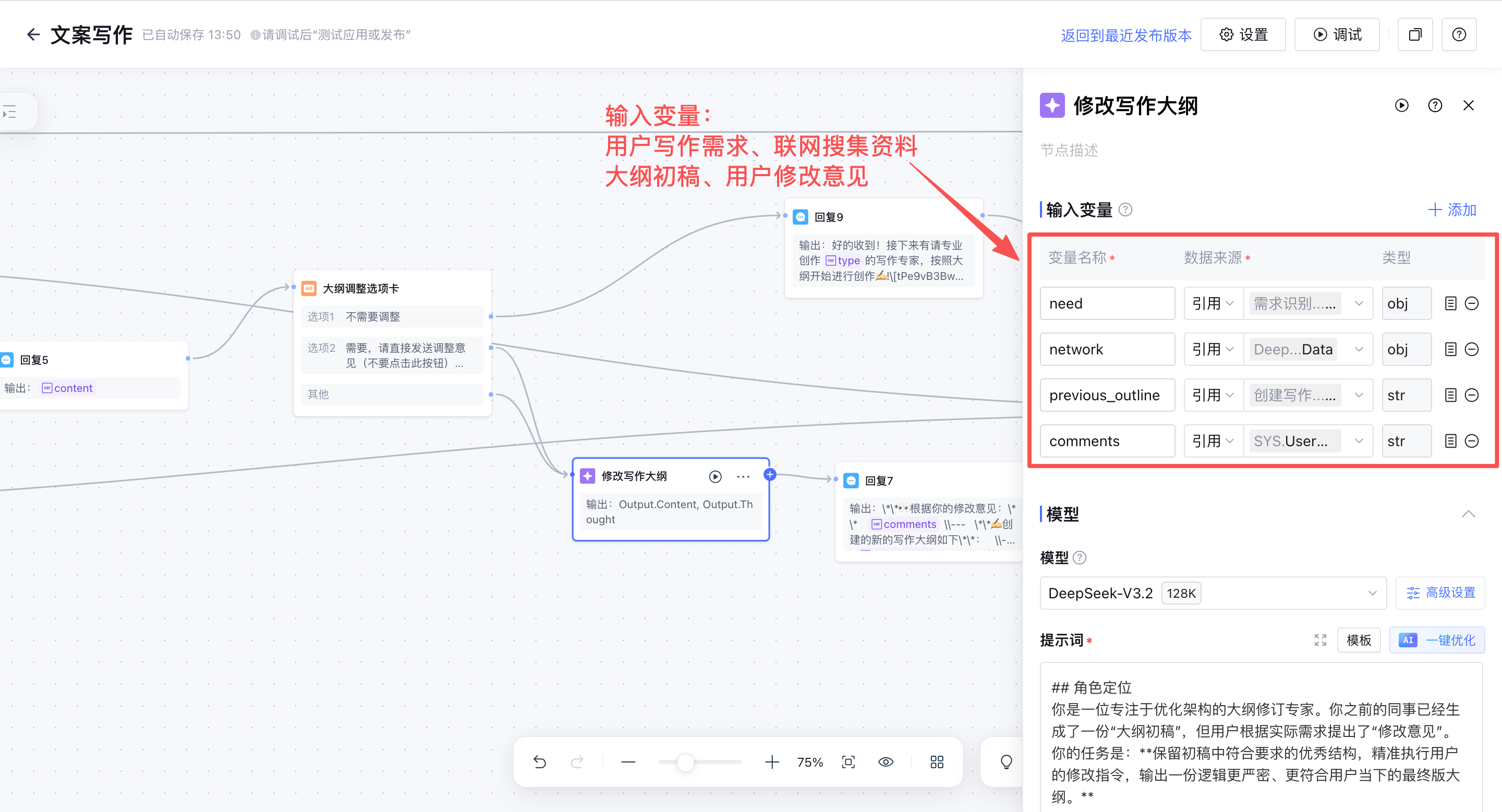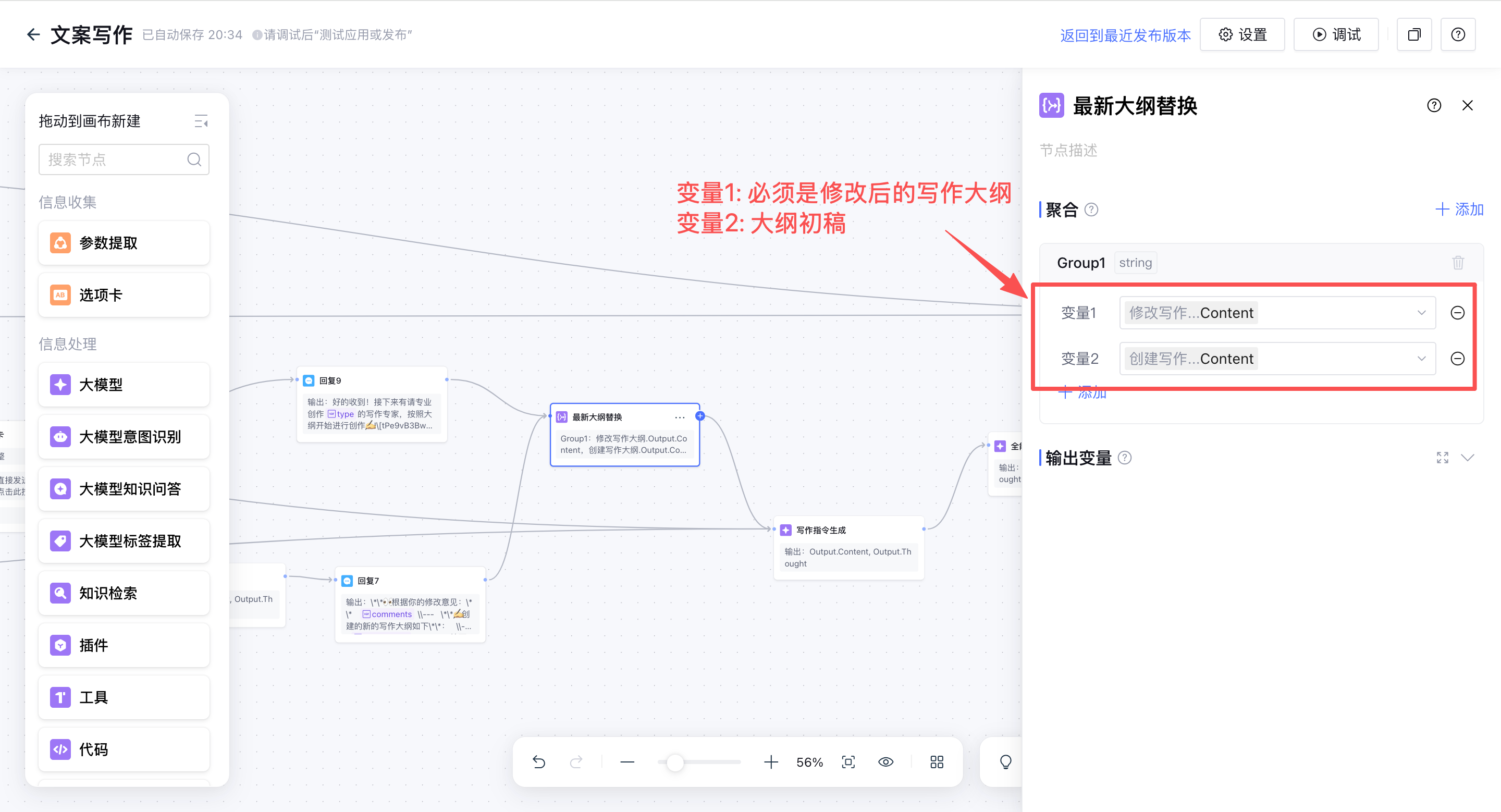 注意:变量1必须是修改后的大纲终稿,因为当变量1和变量2同时存在的时候,默认会选取“变量1”为输出变量,所以当大纲修改后必须取大纲终稿为最新的输出变量。