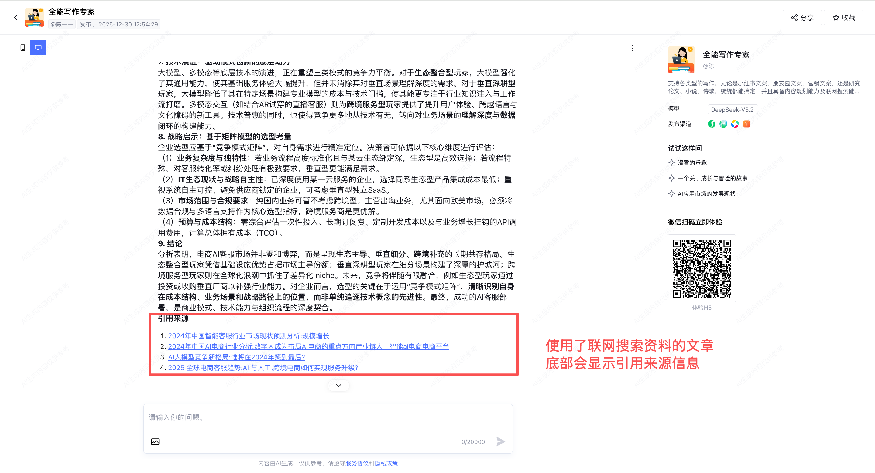 使用了搜索资料的文章会在底部显示【引用来源】网页地址信息,方便用户回溯检查内容的真实性。