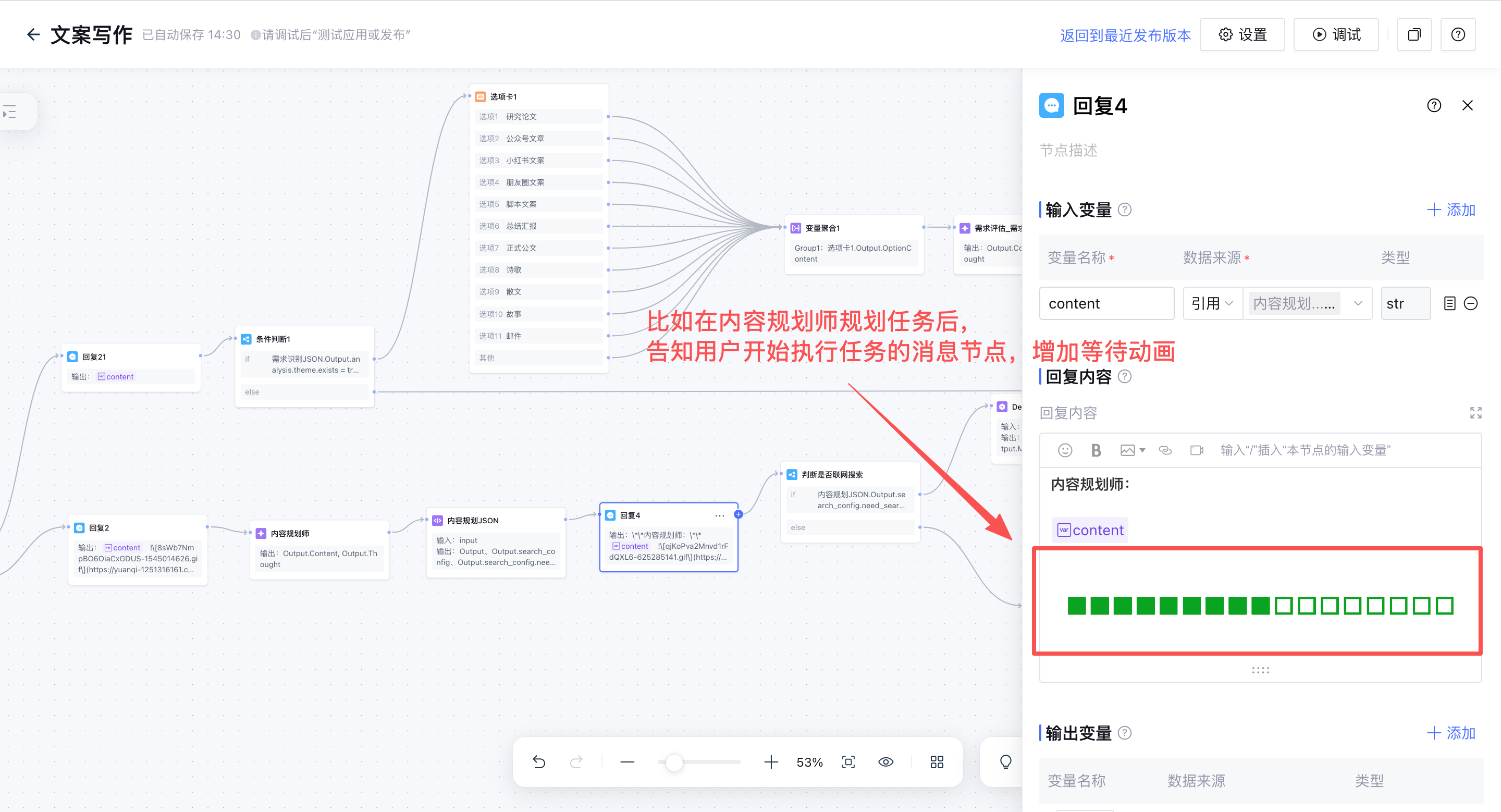 这里刚好受到设计【写作类型选项卡节点】的启发,表面上是让用户点击按钮做选择题,实际上是可以通过点击选项或发送文字,产生新的用户输入,通过这样的方式可以实现「中途收集用户修改意见」的节点功能,即用户需要在选项卡节点中发送修改意见。