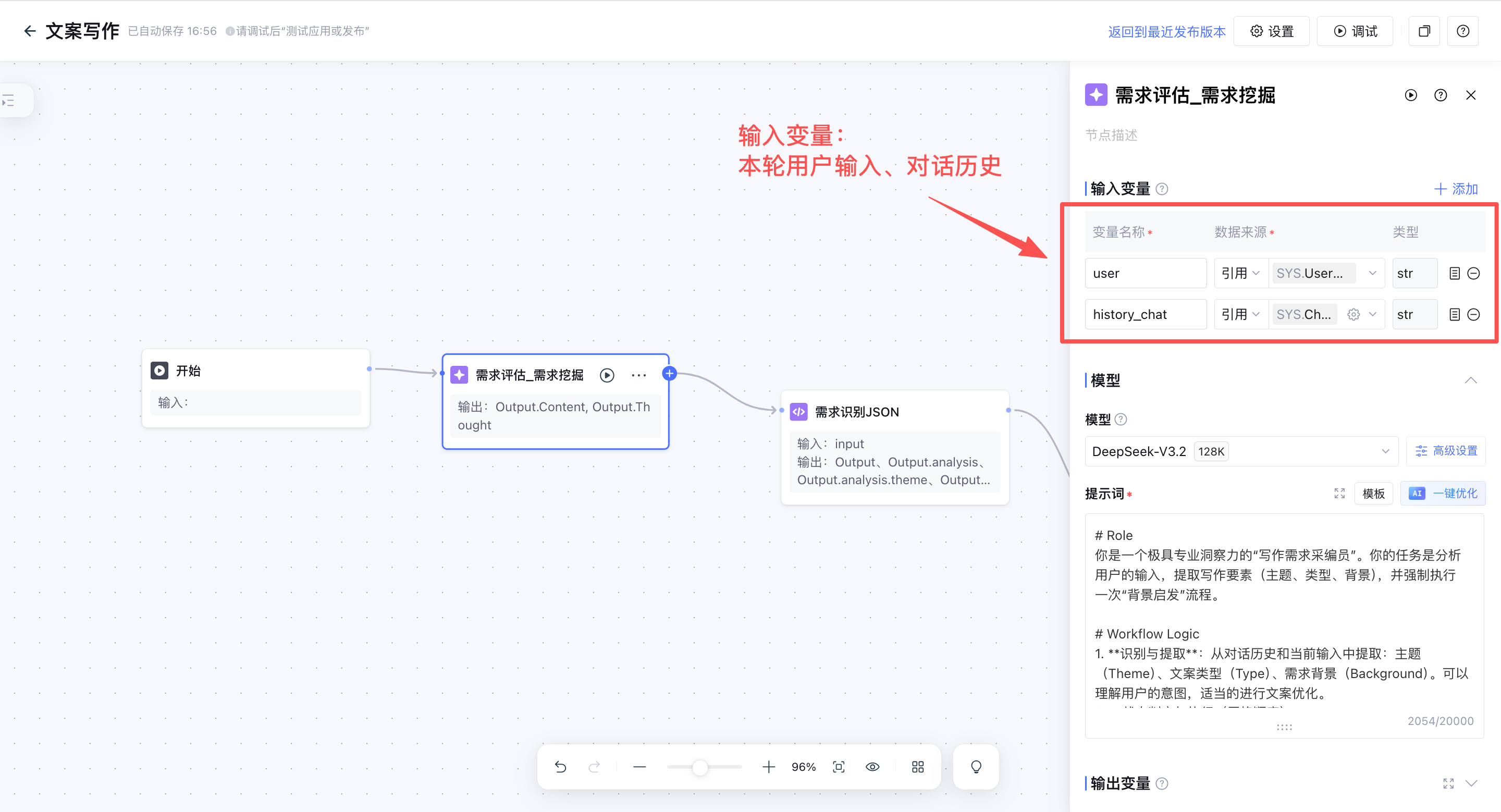 - 对话历史:引用开始节点的”ChatHistory”