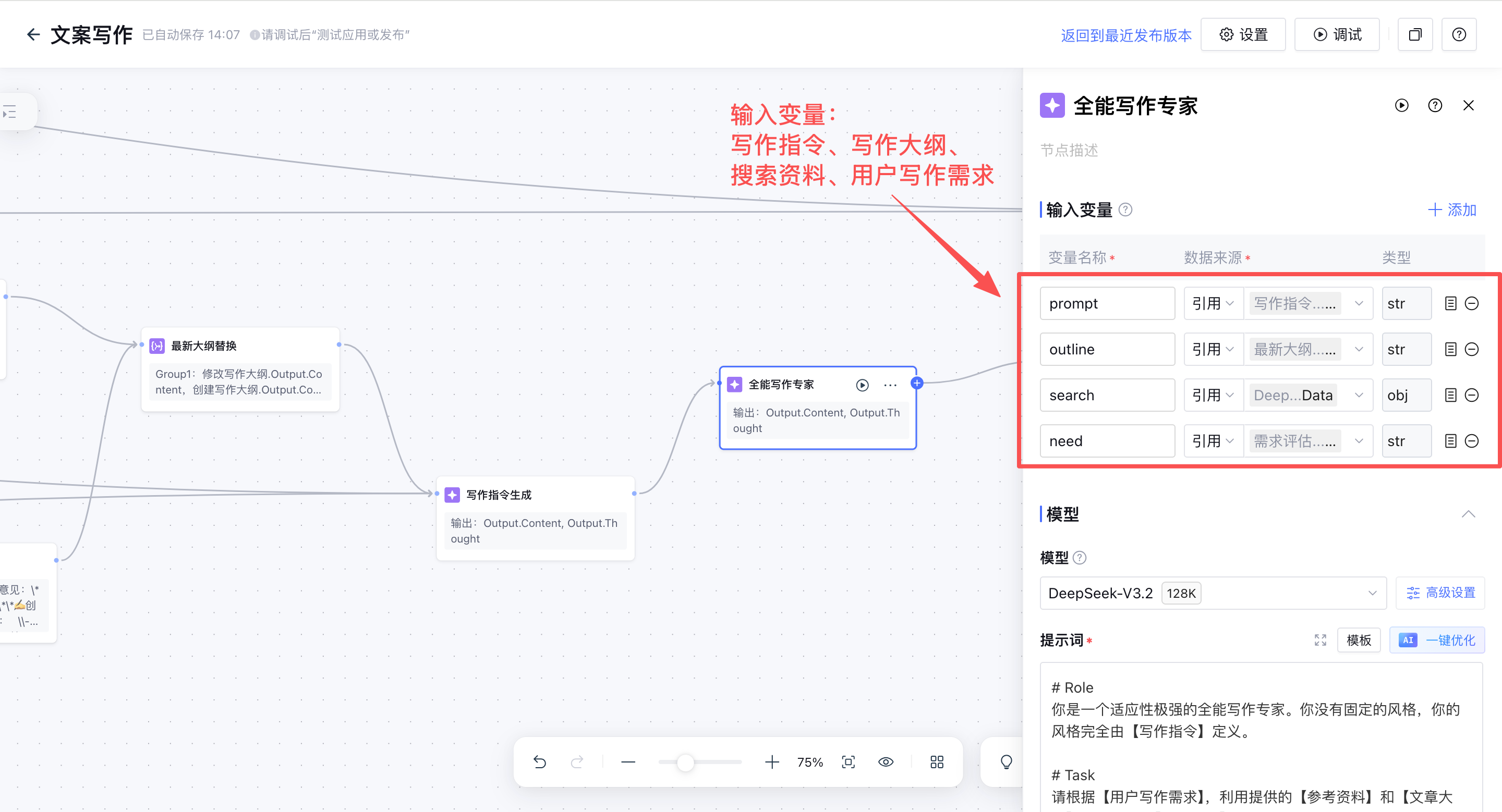- 生成写作专家指令:接收用户写作需求、创作资料,由【写作专家指令生成大模型节点】生成写作专家提示词。