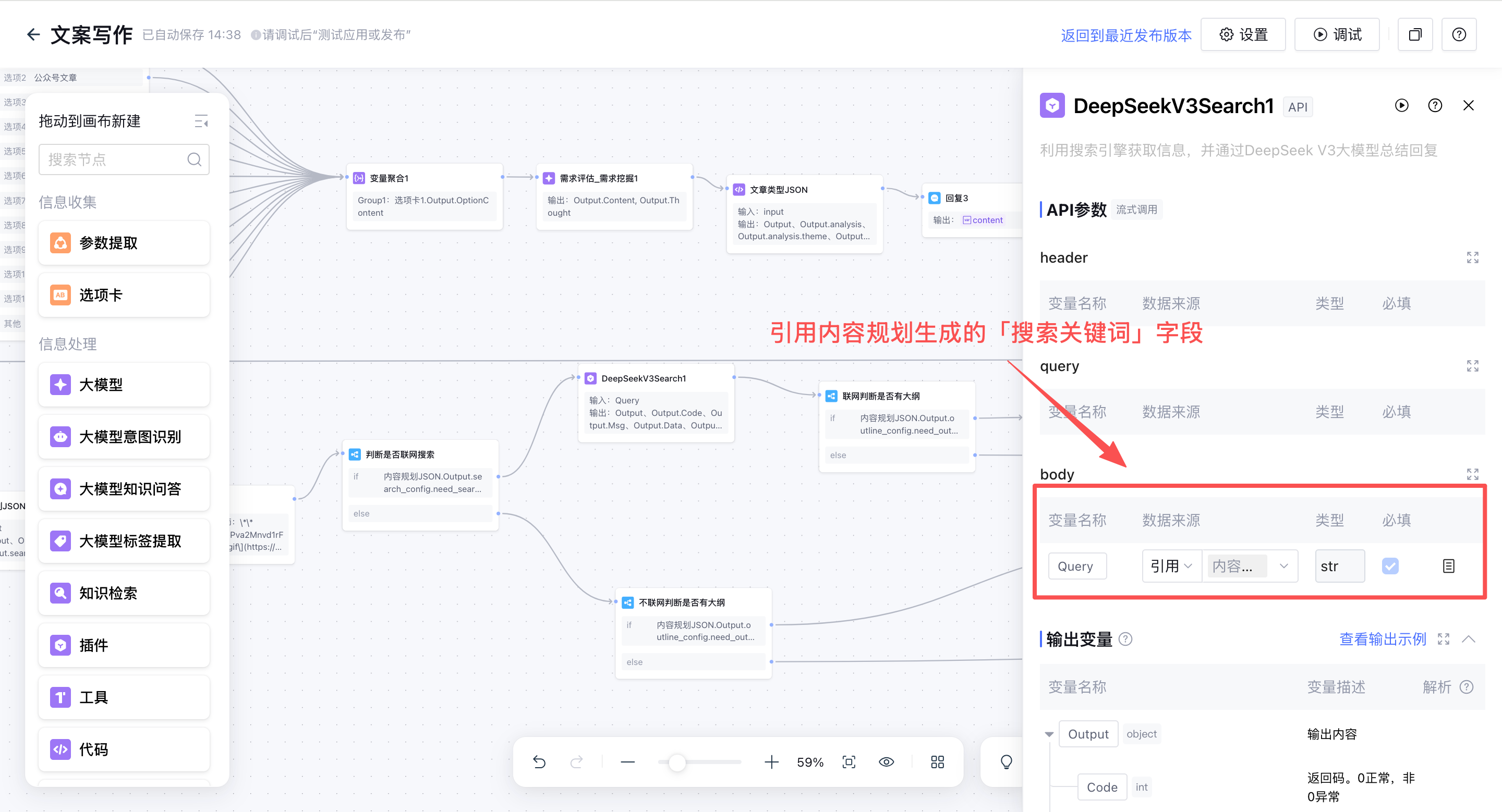 填写API参数的“Query”变量:引用【内容规划大模型节点】生成的“搜索指令”字段。