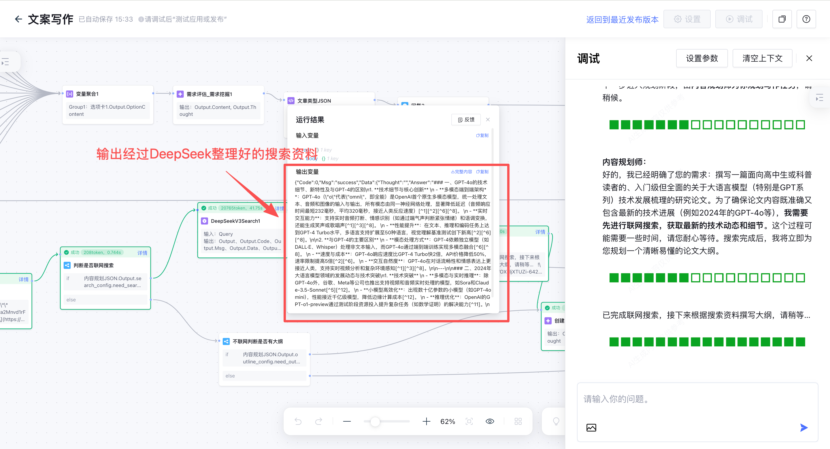 在工作流中调试,查看调用联网搜索插件节点的输出详情,可以看到输出结果是经过DeepSeek总结过的资料信息,方便后续模型节点的直接使用。