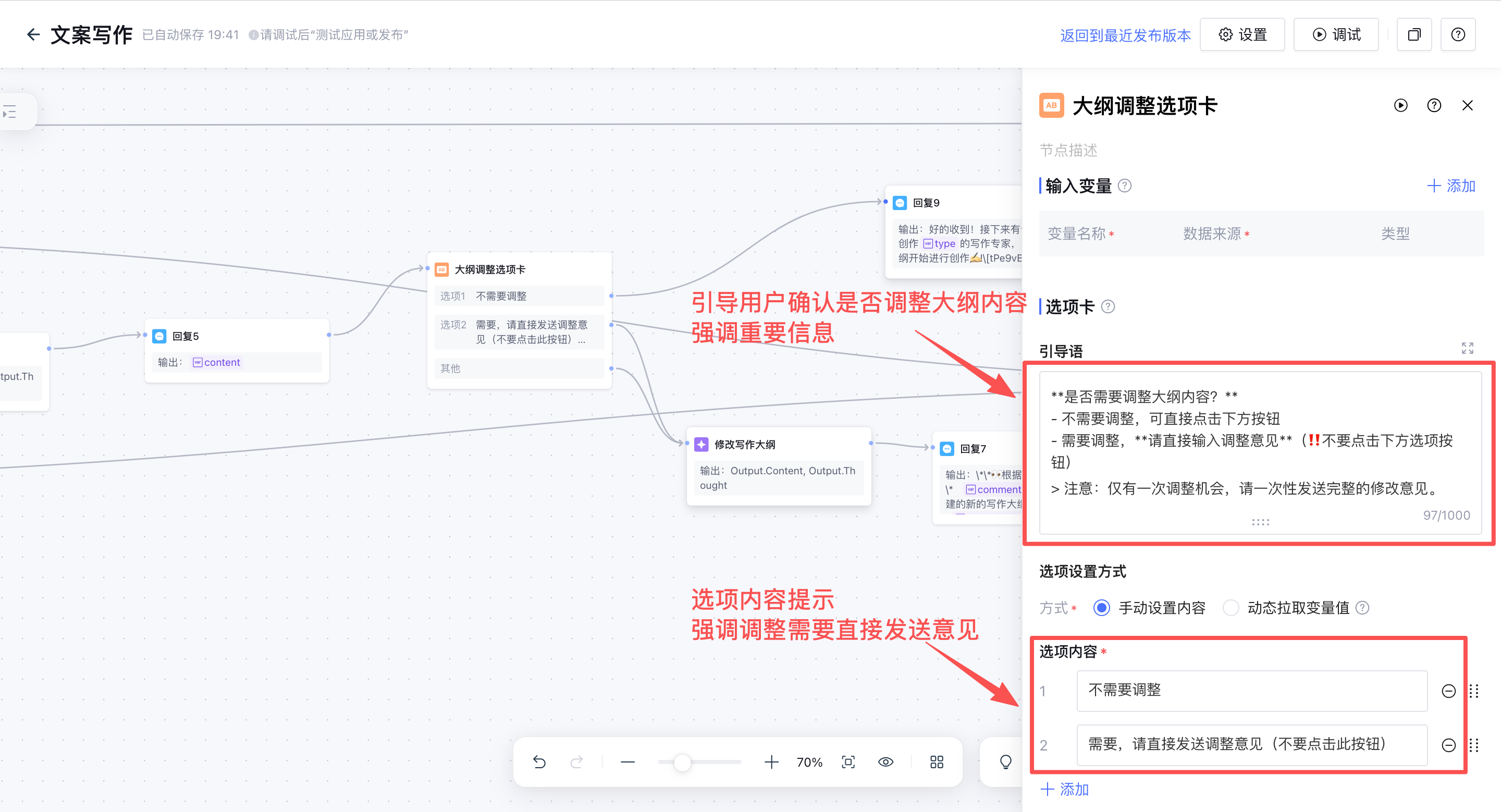 - 由于我们只发送一次大纲调整选项卡(调整完成后直接进入创作阶段),无法实现像循环节点那样多次确认修改的功能,所以需要跟用户强调,只有一次修改机会,防止用户误解可以多次确认修改。