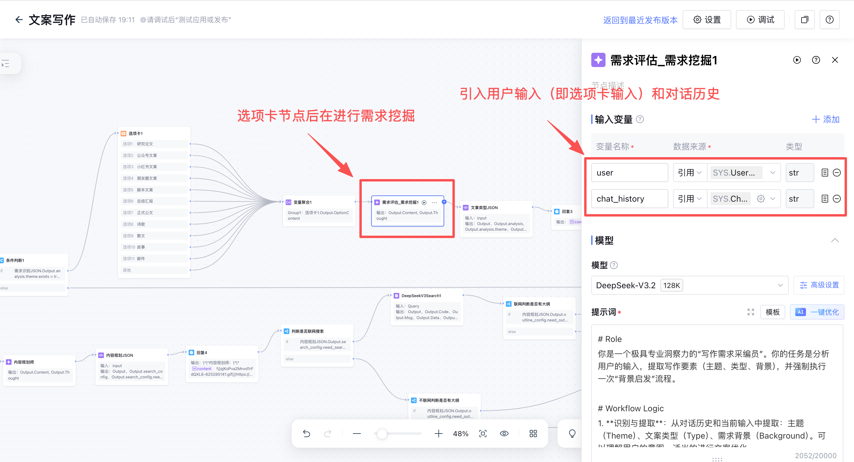 设计细节:我发现选项卡节点的逻辑设计很巧妙,相当于在工作流运行的中途收集用户需求,可以实现短暂的跳出工作流,接收新的用户输入(即开始节点的系统变量”UserQuery”),又再一次进入工作流,所以在选项卡节点后边,再次增加一个和之前相同的【需求挖掘大模型节点】,实现对选项卡节点的“用户输入”进行新一轮的决策引导,相当于完成了一个小的“需求挖掘闭环”。