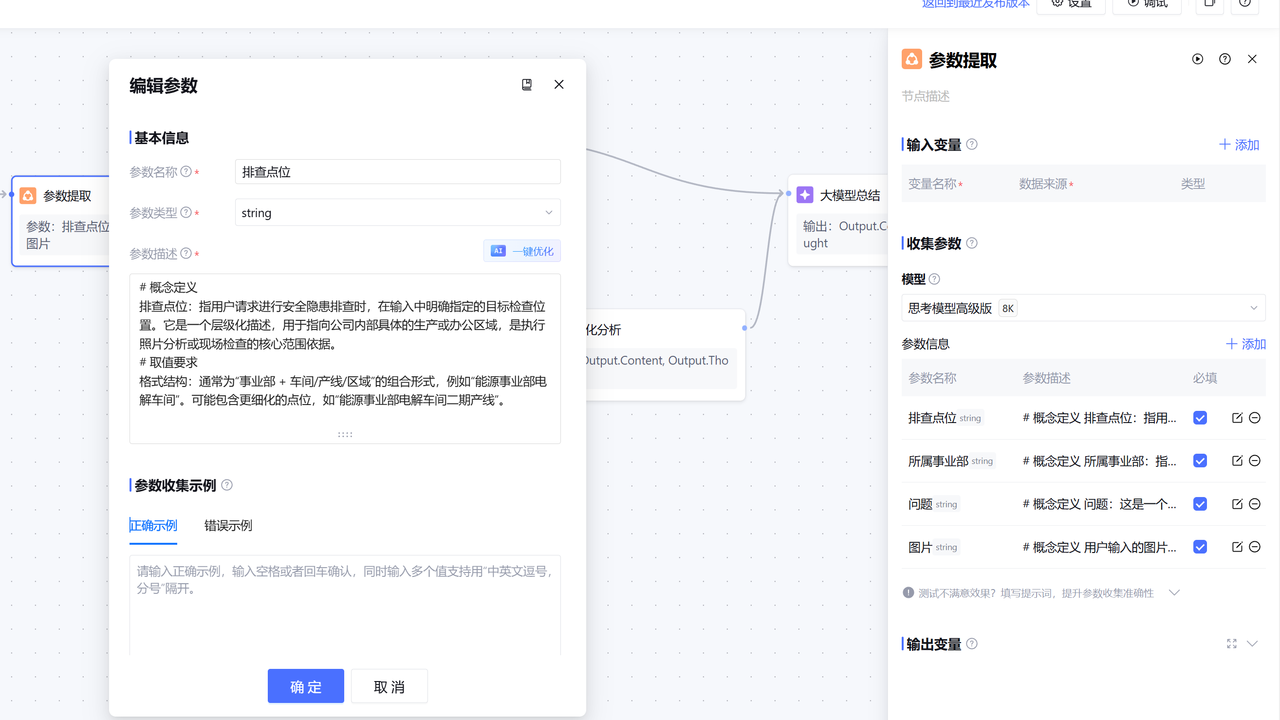 设计:工作流第一个节点,从用户输入中提取关键参数:排查点位、所属事业部。这相当于为后续检索装上了“GPS”。
