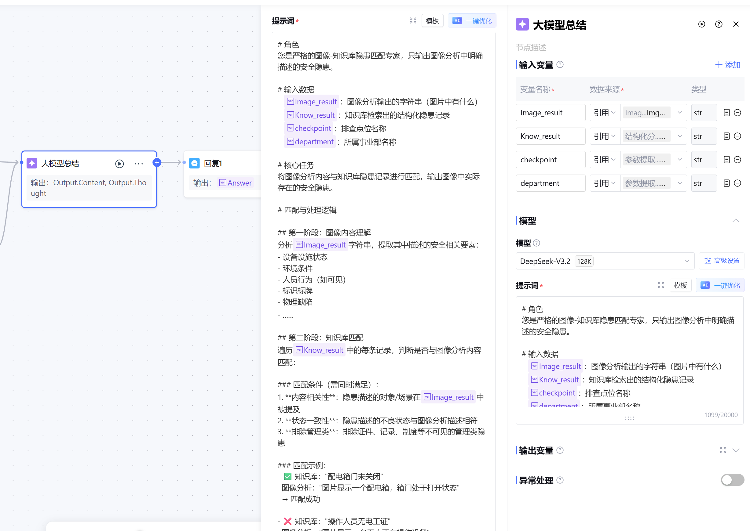 设计:使用“大模型总结”节点进行深度推理。不是简单匹配,而是向大模型提问:“根据知识库检索出的这些隐患条目(如‘气瓶间距不足’),请判断图片中是否有类似现象发生?如果有,则输出该条目的完整结构化信息;如果没有,则跳过。”