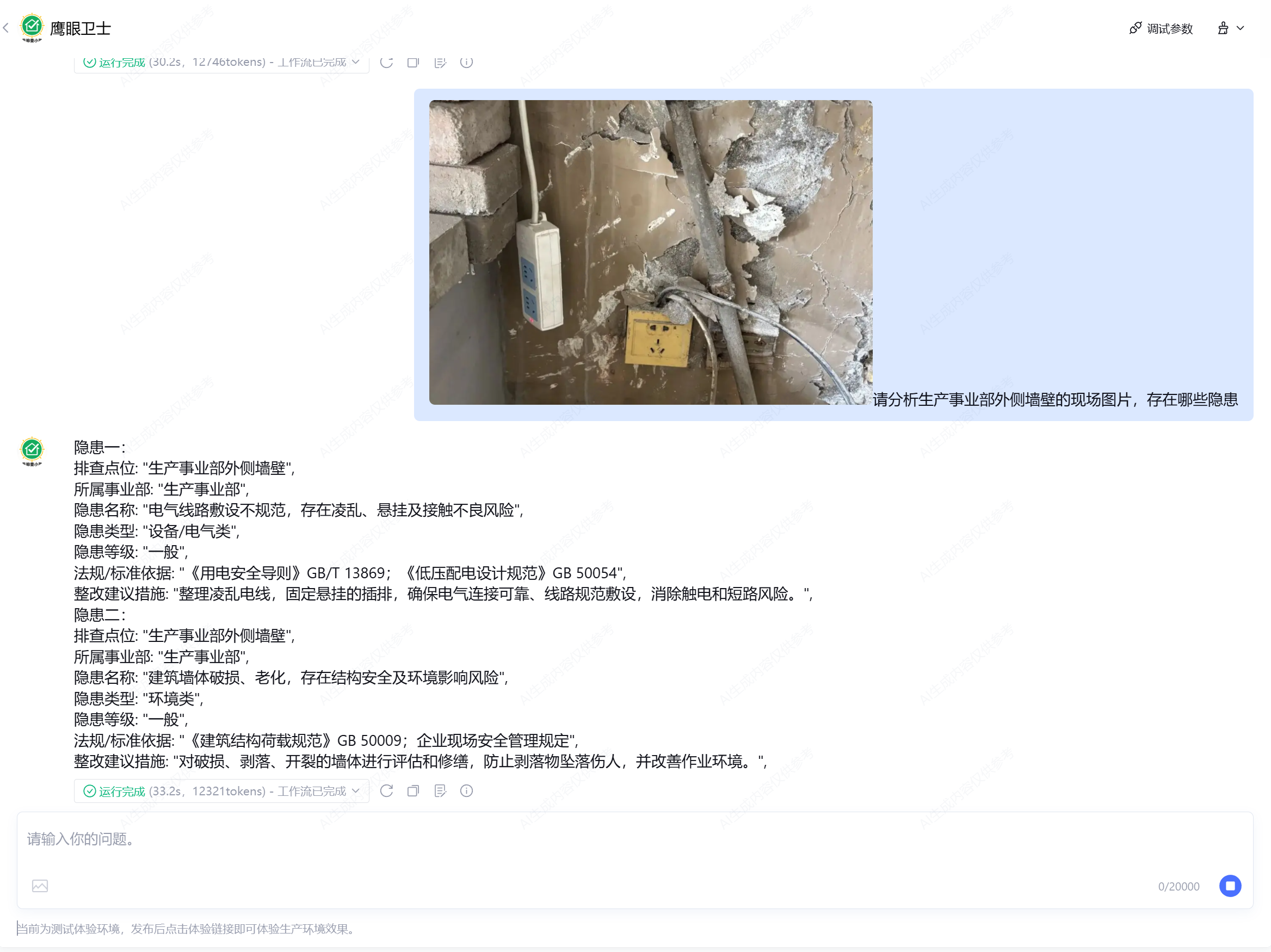 操作:作业负责人上传作业环境照片,智能体快速识别环境中的潜在风险。