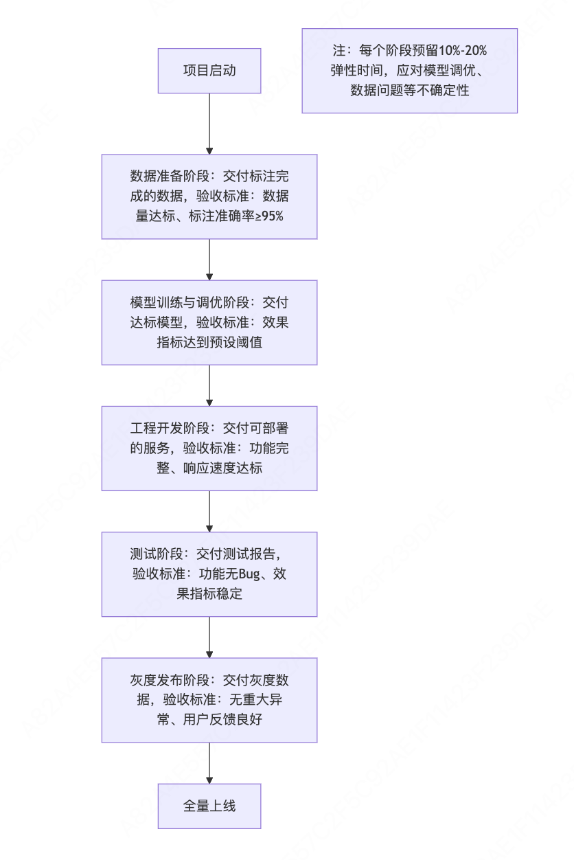 - 预留弹性时间:每个里程碑预留10%-20%的弹性时间,应对模型调优、数据问题等突发情况,避免一个环节延期导致整体项目滞后。