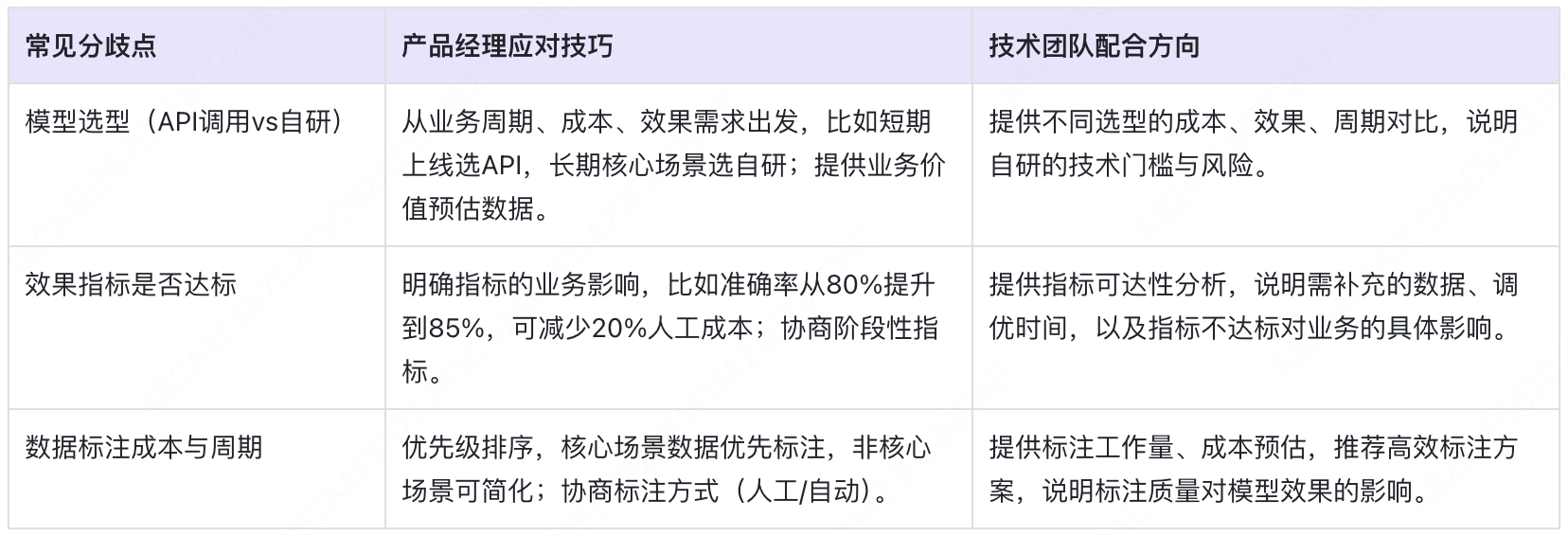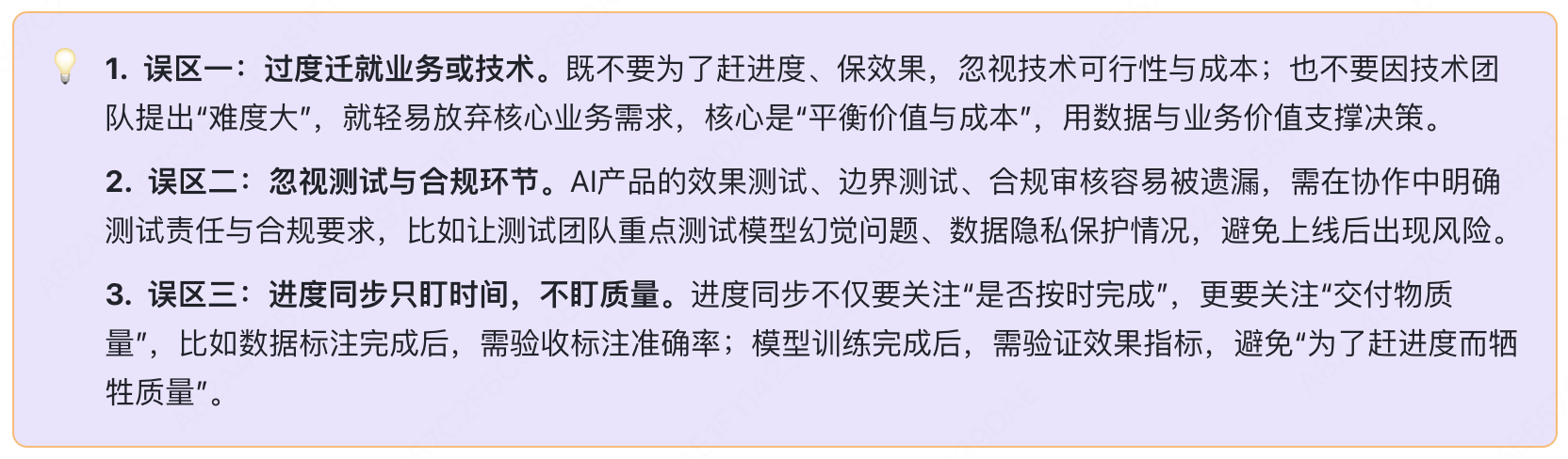 - 需求沟通:信息不对称:产品经理用业务语言提需求(如“让AI更智能”),技术团队需技术语言落地,易出现“需求理解偏差”;同时产品经理可能忽视技术边界,提出无法实现的需求。