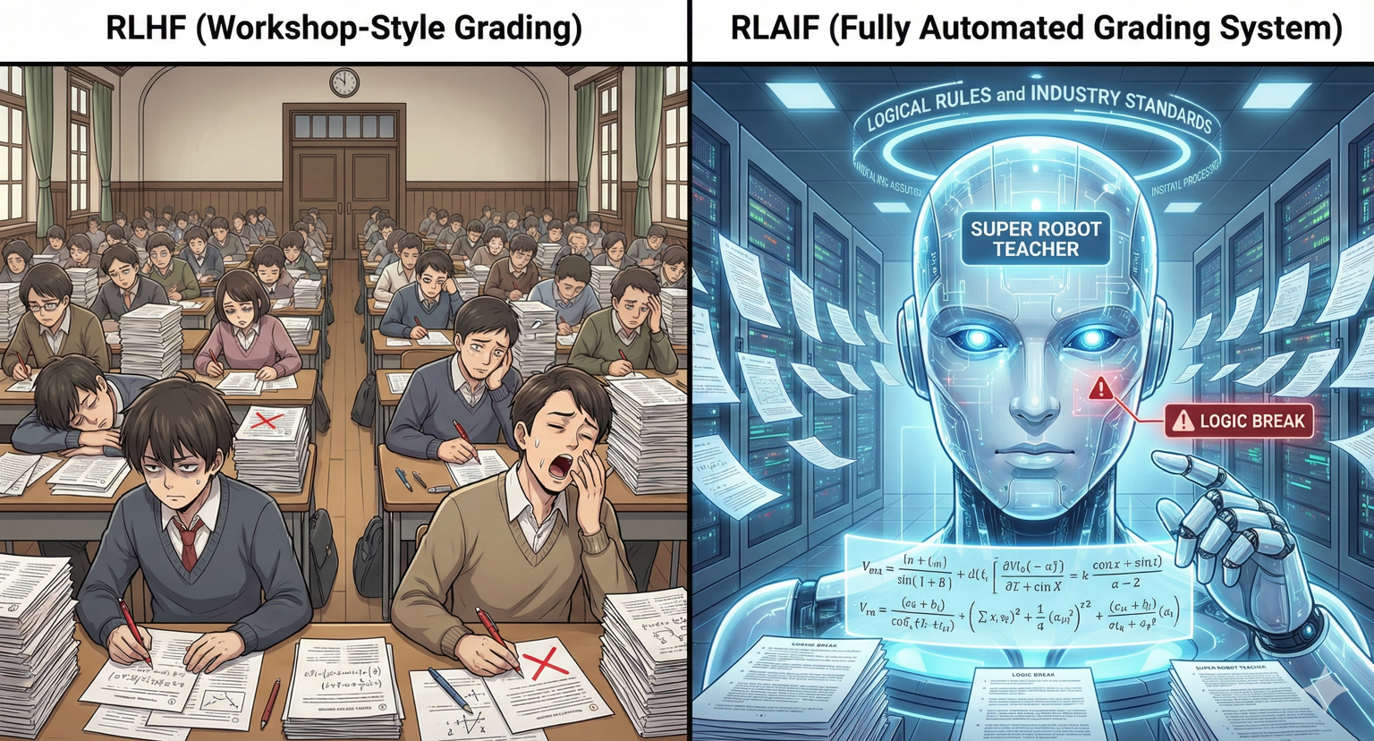 RLHF(作坊式批改):就像一所学校请了几千名老师,每人手里拿着红笔改卷子。老师会累、会困、甚至会因为看不懂深奥的题目而乱改。这种方式不仅慢,而且很难教出超越老师水平的学生。