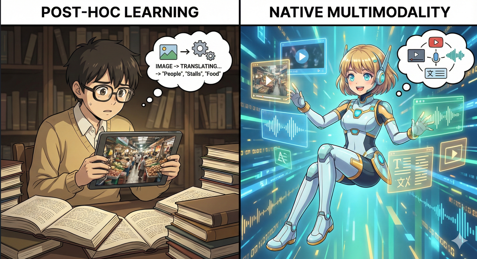 在 2026 年,领先的架构(如 Gemini 3.0)已经彻底摒弃了“视觉编码器 + 语言模型 + 音频解码器”这种拼凑式的“插拔架构”。