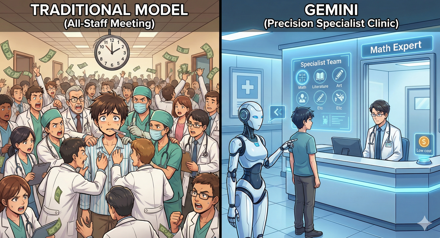 传统模型(全员大会):无论病人是感冒还是骨折,医院里所有的医生(几千亿个参数)都必须全部到场会诊。不仅诊费极高,而且效率极低,病人等得焦头烂额。