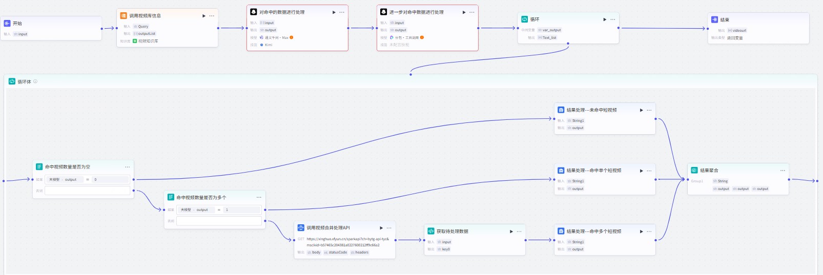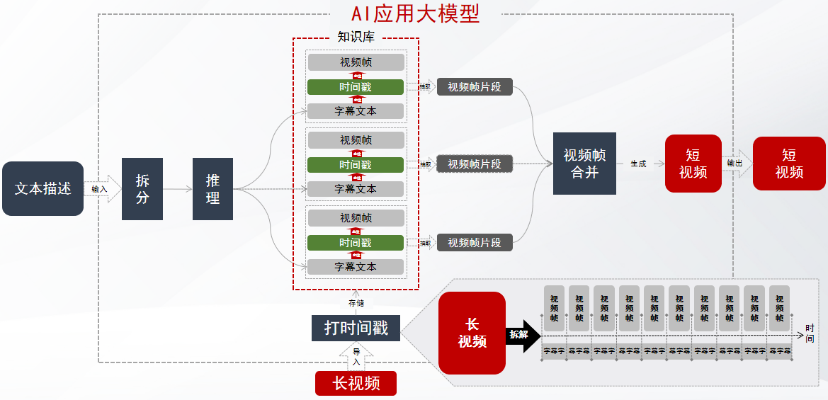 • 从平台用户角度,用户通过输入文本描述与大模型交互,大模型会基于解析、推理到的用户诉求来匹配视频库信息,如果命中一个短视频则将结果直接推送给用户,如果命中多个短视频,则自动将多个短视频合并后推送给用户。
