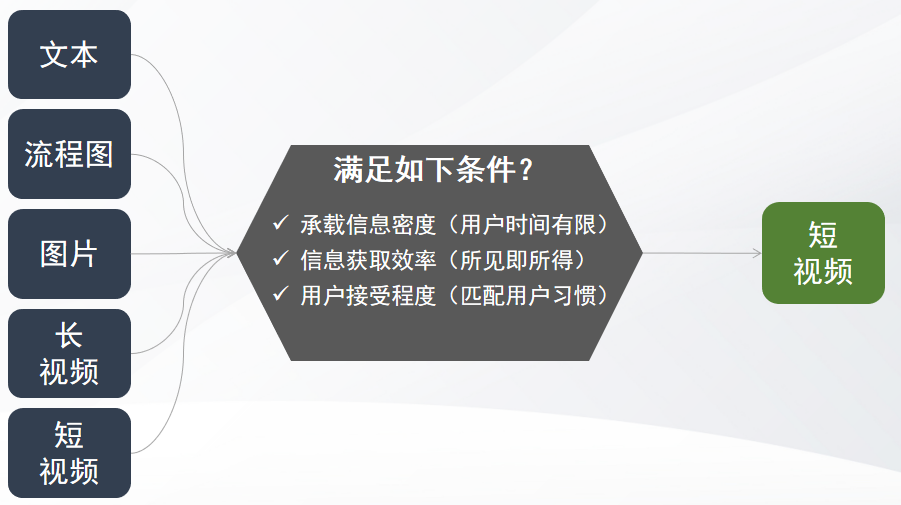 为了选择最合适的媒介,我们从媒介所承载的信息密度、信息能够被平台用户消化的效率以及平台用户对此种媒介的接收程度等三个维度来评判,最终确认短视频最适合作为平台产品功能推送和被消化的媒介。(图2)