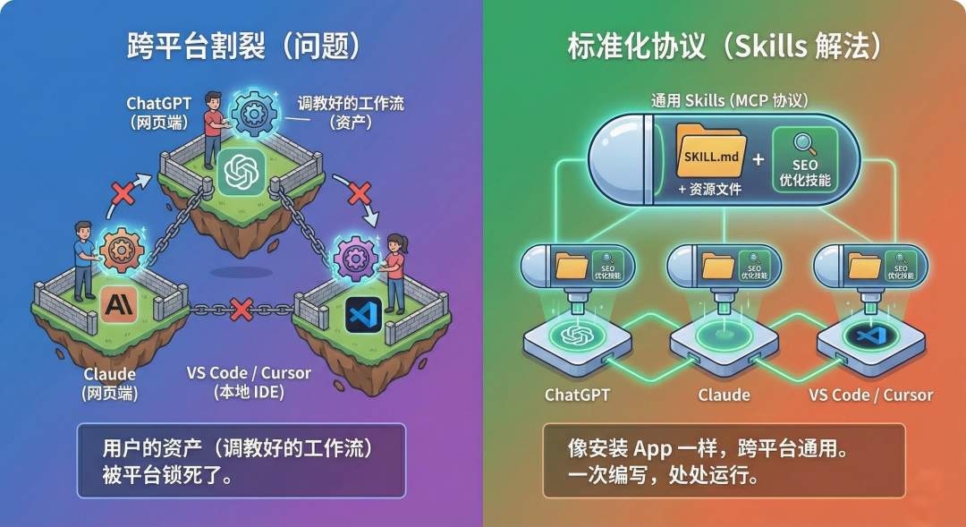 问题:以前你在 ChatGPT 里调教好的 GPTs,没法直接搬到 Claude 里用;你在网页端调教好的 AI,在本地编程软件(如 Cursor/VS Code)里又要重新教一遍。