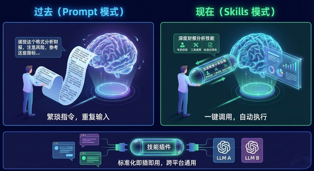 过去(Prompt 模式)每次都要告诉 AI “请按这个格式分析财报,注意风险,参考这些指标…”