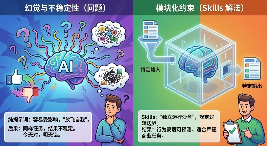 Skills 的解法:模块化约束。Skills 像是一个“独立运行沙盒”,它规定了特定的输入输出格式和逻辑边界。通过这种封装,AI 在执行该技能时,行为会变得高度可预测,更适合处理严谨的商业任务。