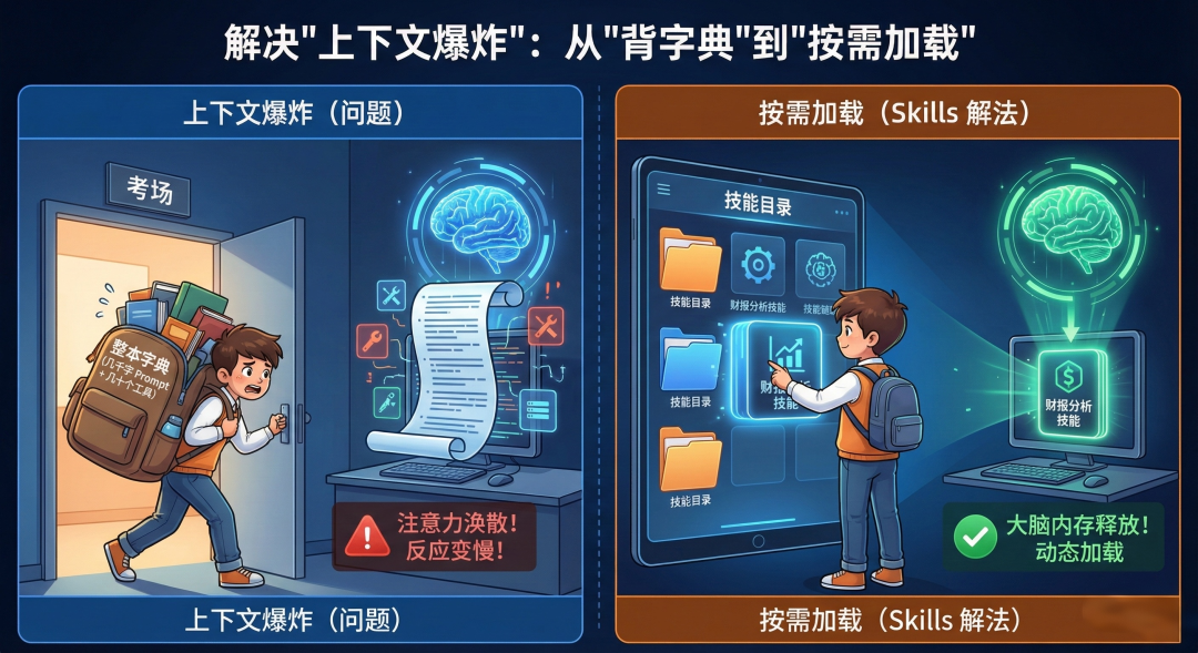 Skills 的解法:按需加载。Skills 允许 AI 先看到一个“技能目录”,只有当它确定需要“财报分析”这项技能时,才会去动态加载那个文件夹里的详细说明。这极大地释放了 AI 的大脑内存。