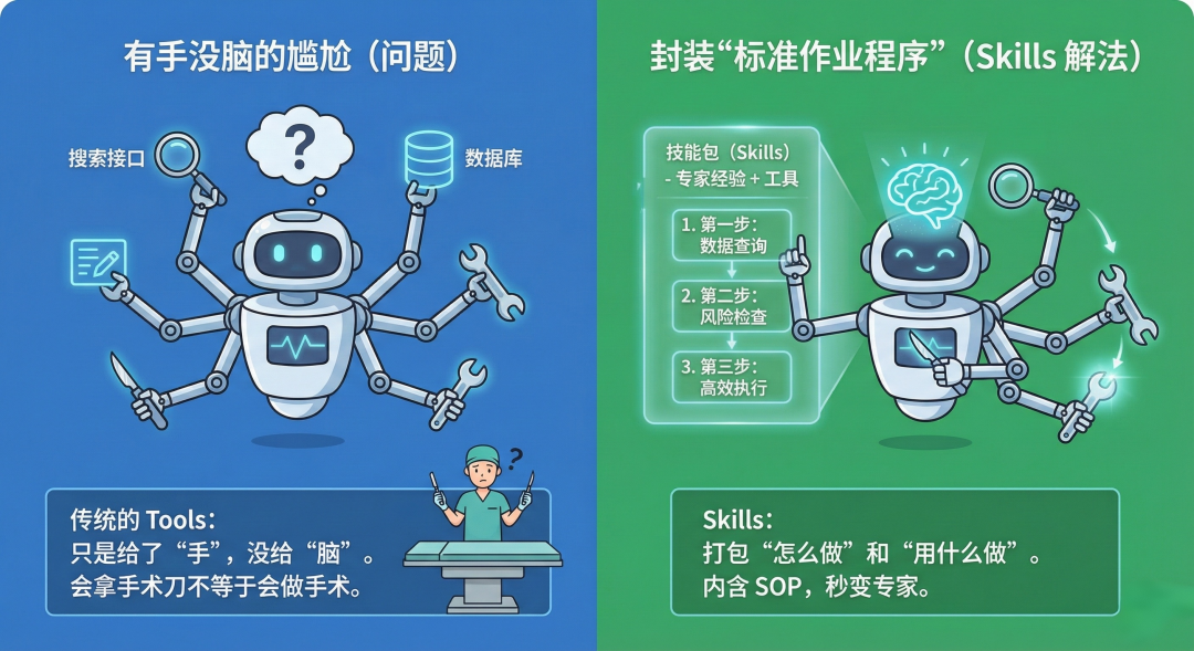 Skills 的解法:封装“标准作业程序”。Skills 里不仅有工具,更有“专家经验”。它告诉 AI:第一步什么,第二步防范什么风险。它把“怎么做”和“用什么做”打包在了一起。