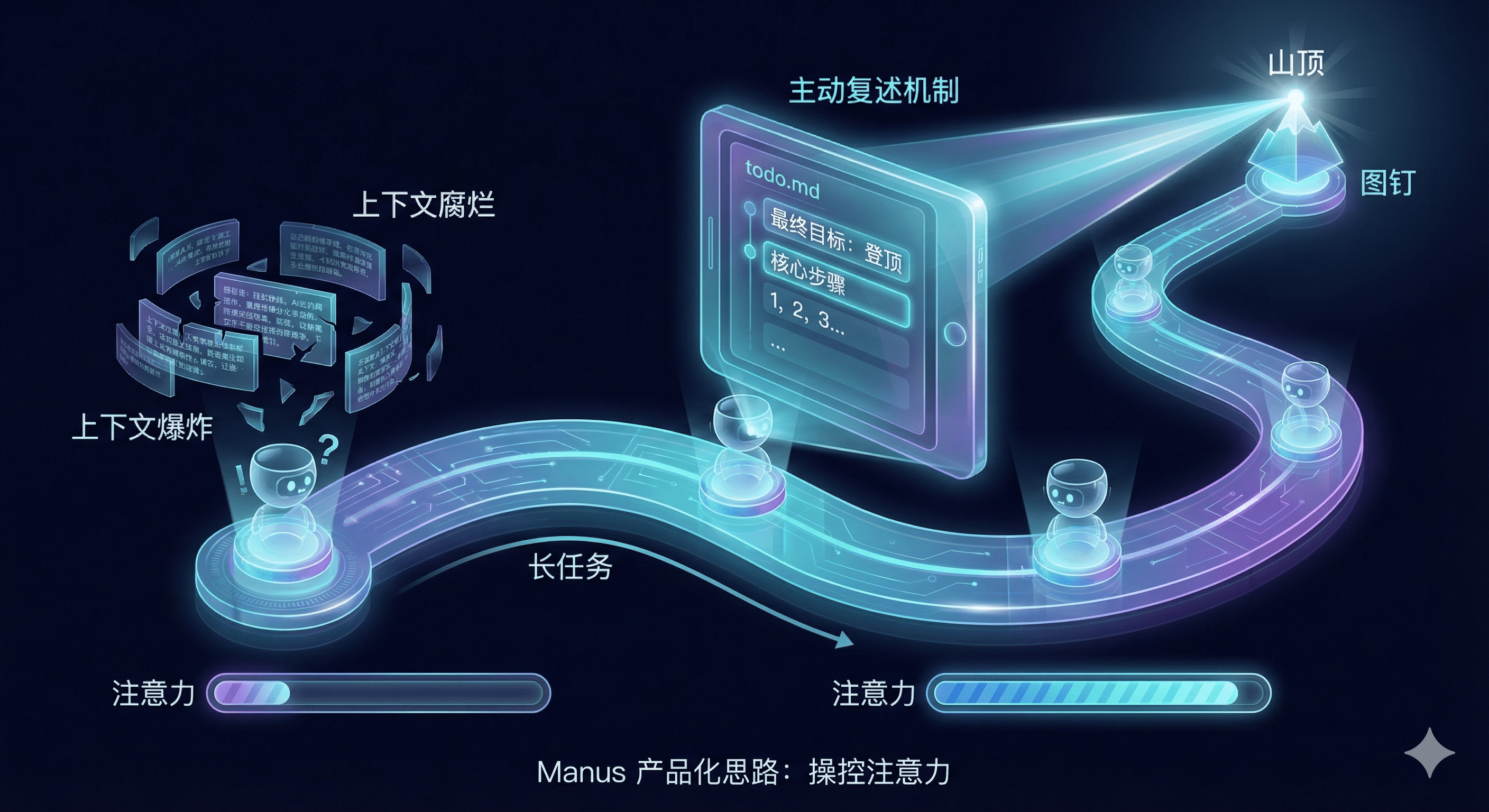 这就像一个登山队员,每走一段路,就停下来抬头看看山顶,确认一下自己的方向。通过这种不断的、主动的“复述”和“回顾”,Manus把最重要的全局目标,像一个图钉一样,死死地钉在了模型有限的注意力范围内。不管中间执行了多少步,产生了多少临时信息,那个最终目标永远不会被“淹没”。
