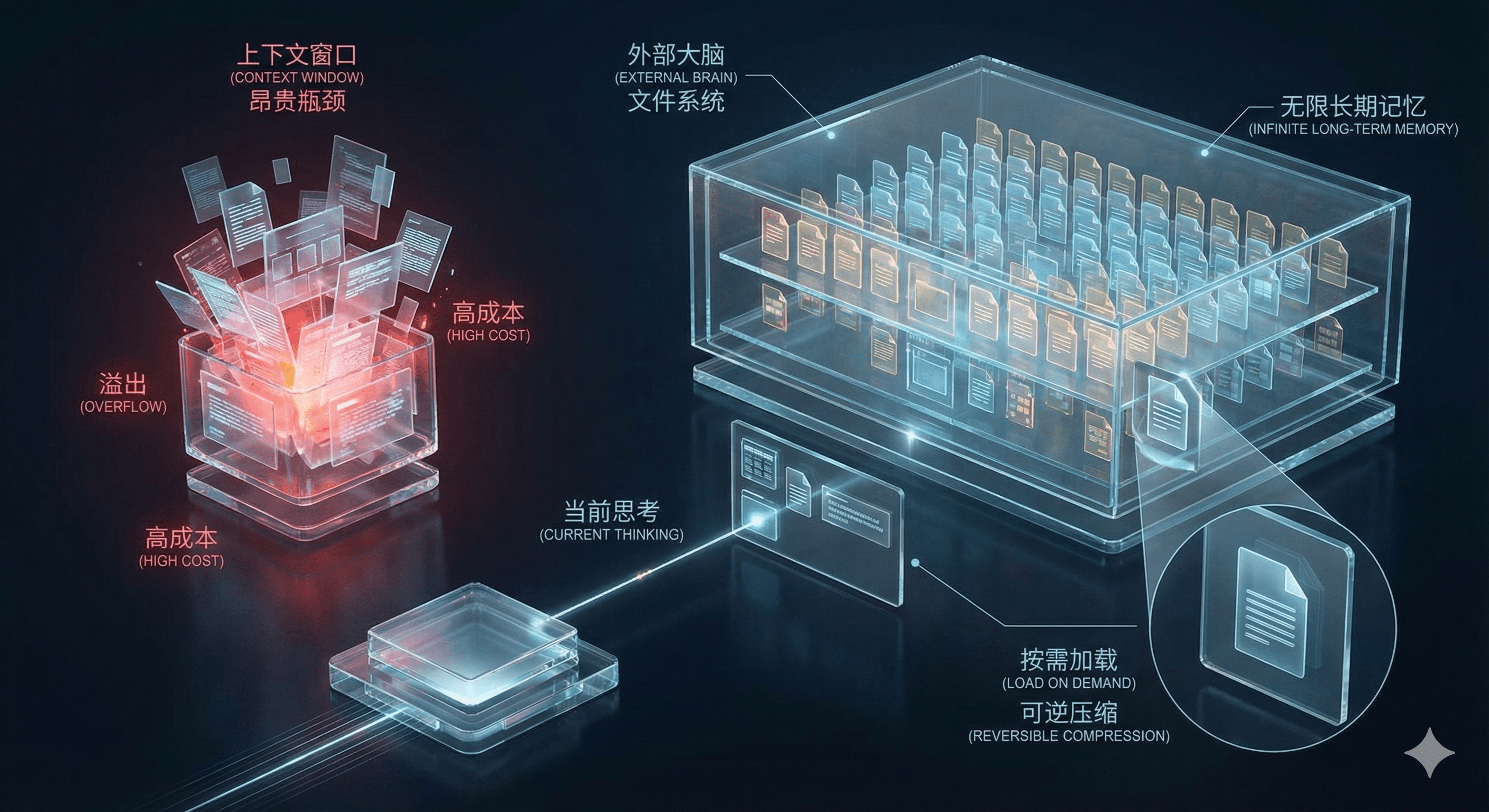 前面我们反复提到,上下文窗口是有限的,是Agent记忆的瓶颈。即使有百万级别的长上下文,对于一个需要处理大量文档、跨越数天甚至数周的复杂任务来说,也远远不够。而且,把所有东西都塞进上下文,成本高得离谱,性能也差得要命。