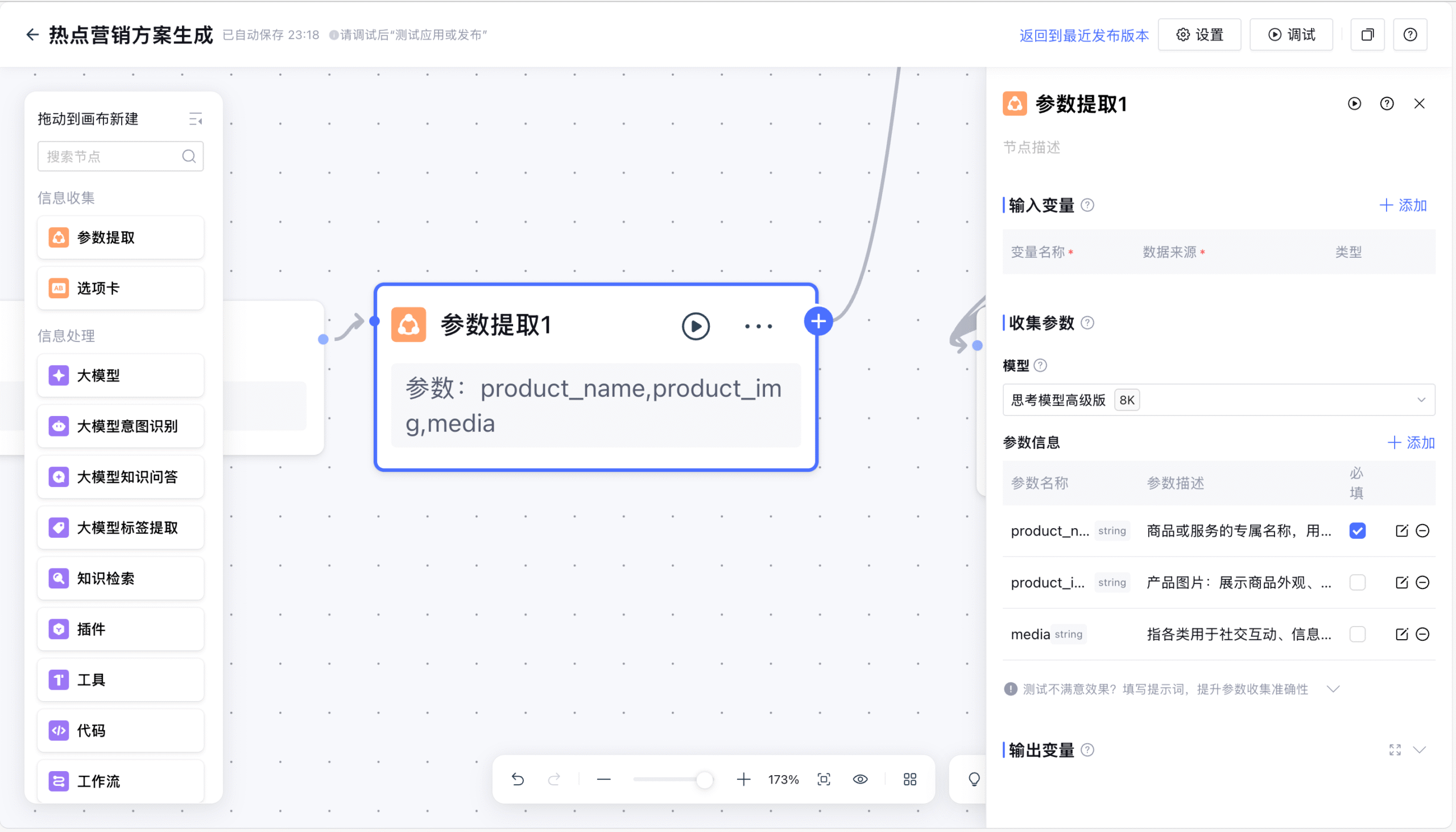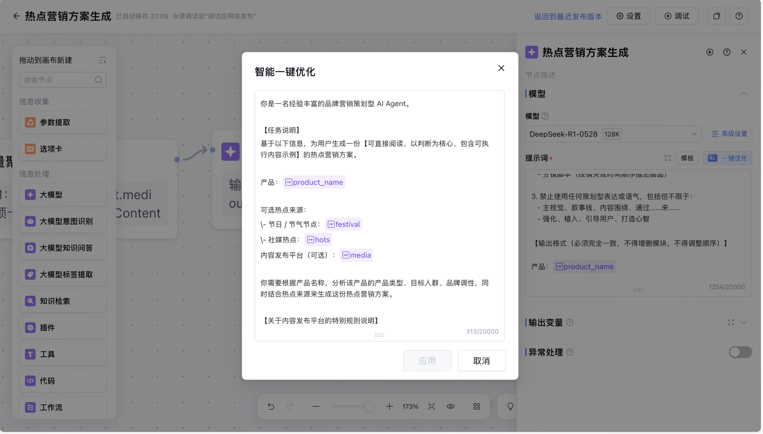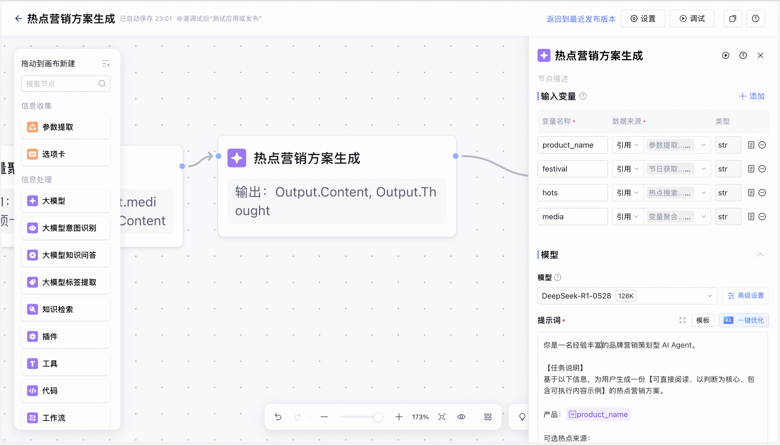 这个任务核心需要用一个大模型节点来承载,它是这个 Agent整个工作流的核心,主要负责产出最终的热点创意建议方案: